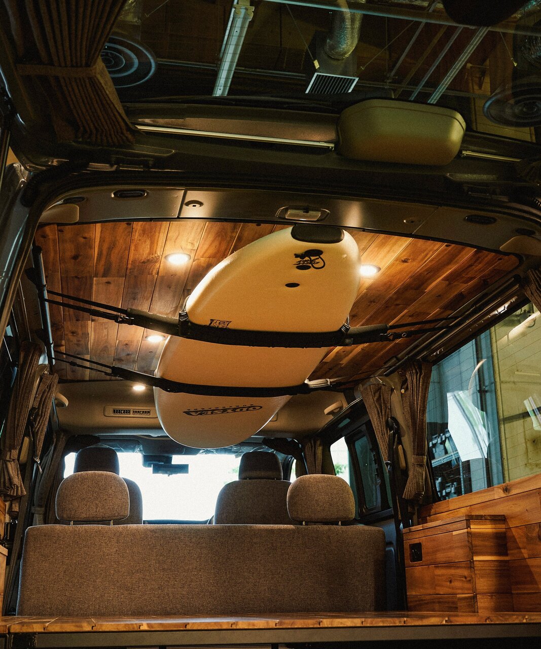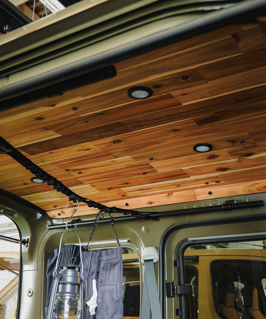 サイドバーに直接物をかけるだけでなく、インテリアバーやハンギングストラップ、ソフトハンギングバーなどのオプションを利用すれば、衣類やギアを吊るすことも可能。最大積載重量は片側10kg(1本あたり)。使い方によっては写真のとおり、サーフボードなど大きなアイテムも積載できます。