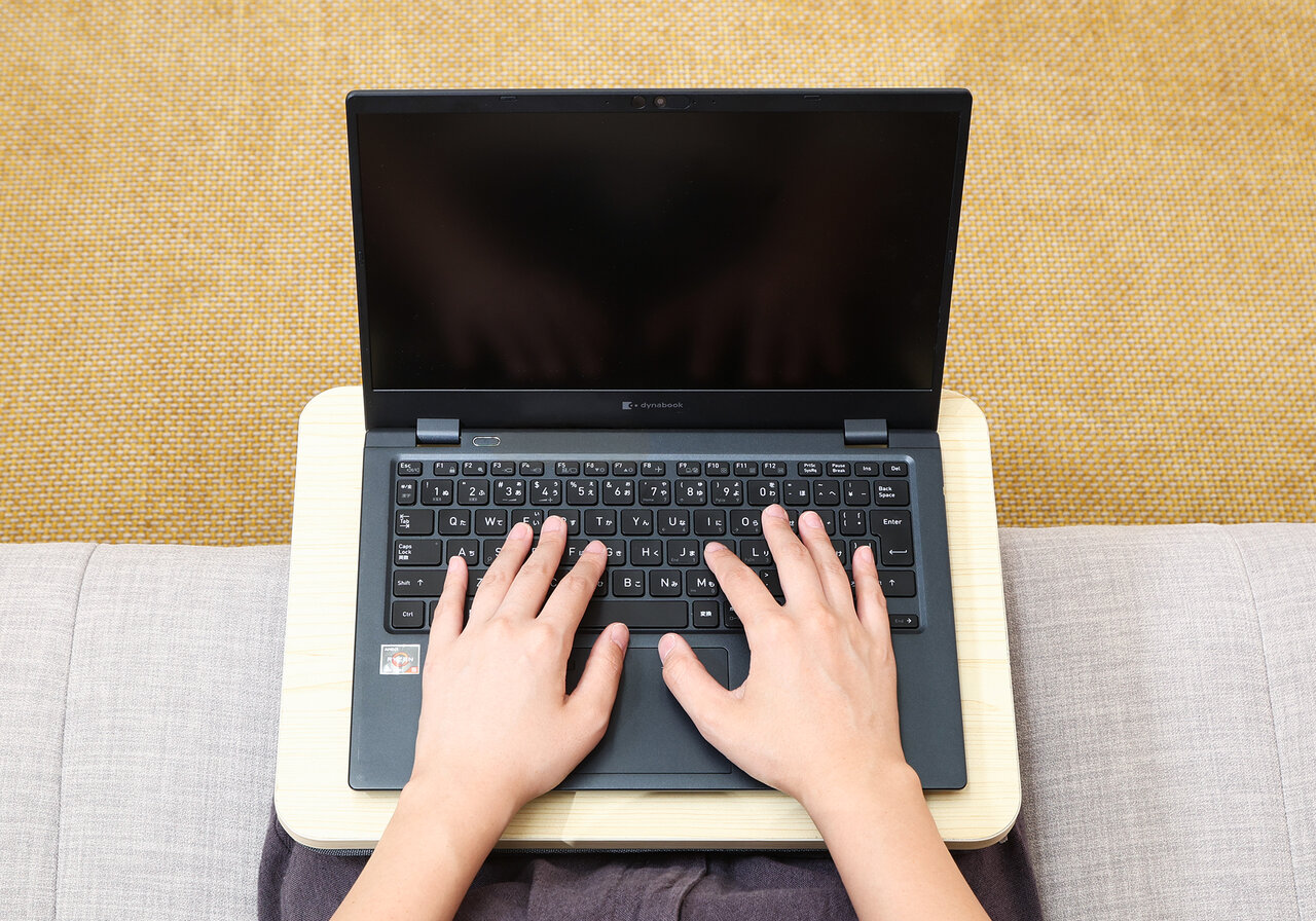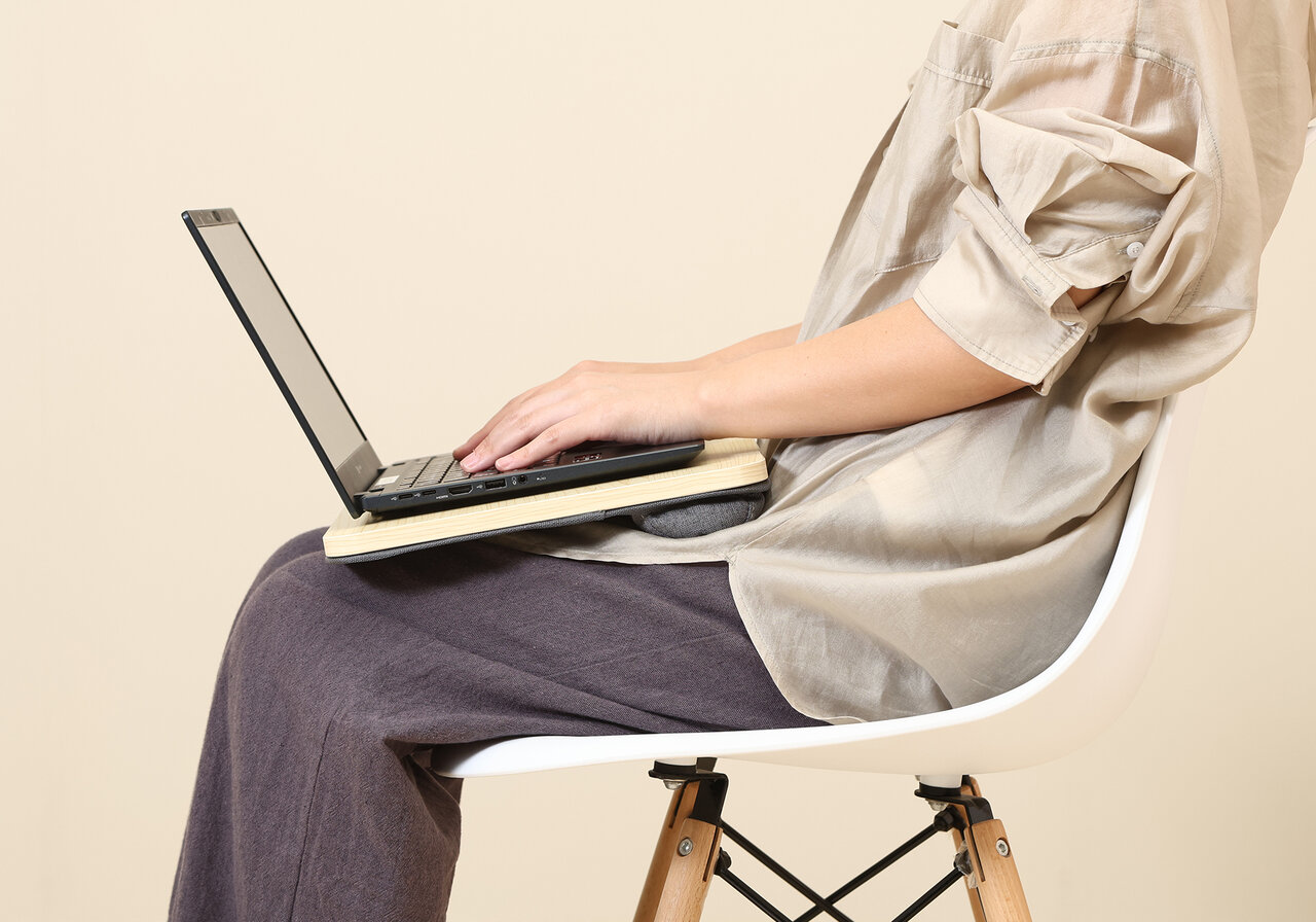 天板サイズは37×26.5cm。13.3型モバイルPCがぴったり収まる設計になっています。裏面に搭載した程よい厚みのクッションが、膝に優しくフィット。約12度の角度がつくため、長時間のタイピングや読書も楽ちんです。