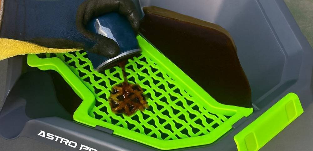 オイルパンは8Lの大容量で、ほとんどの乗用車で使用できます。ドレンボルトやオイルフィルターを一時的に置いておけるネットがついているため、廃油に沈む心配はありません。デフケースやホーシング車のナックル作業など、オイルやグリスで汚れやすい作業の受け皿や汚れたパーツ置きにも使えます。