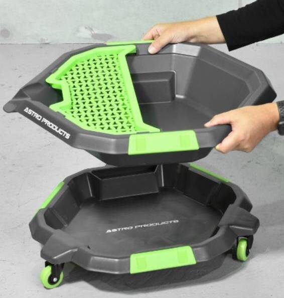 クルマやバイクのメンテナンスなどで、あると便利なのが「ツールトロリー&オイルパン8L」。最大の特徴は、キャスター付きのツールトレーの上にオイルパンがぴったり重なる設計。この状態で使えば、高さ約19cmのキャスター付きのオイルパンとして活躍してくれます。
