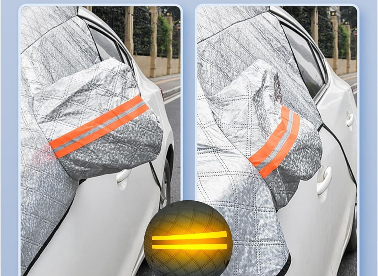バックミラーカバーには反射警告テープがついていて、夜間でも車両の目印に。暗い中で他の車が接触してしまったり、クルマに傷がついたりするのを防ぐことができます。