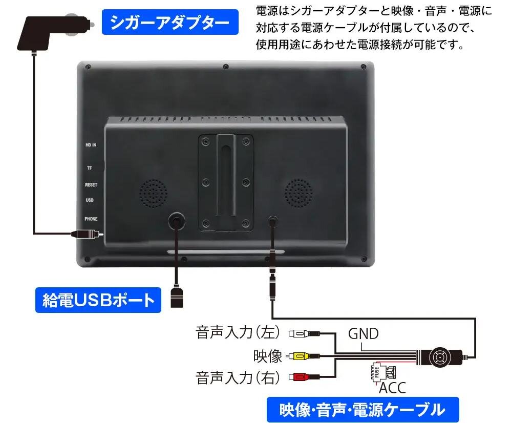 電源はシガーソケットと電源ケーブルの2系統、電圧はDC12/24Vと広範囲に対応。乗用車だけでなく、トラックなど大型車両でも利用できます。