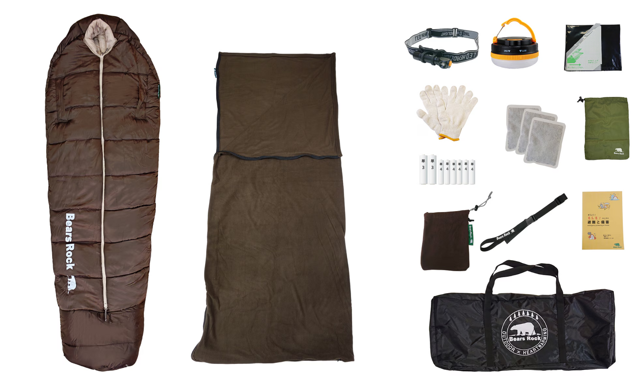 セット内容/マミー型センタージッパー寝袋-15℃、インナーシュラフ(くるむんフリース)、LEDヘッドライト、LEDランタン、非常用簡易トイレ(3回分)、カイロ×3個、カイロ袋、オリジナルポーチ、軍手、乾電池、防災冊子、収納袋、バックル付きベルト、カラビナ付きミニライト、カラー:シルキーブラウン、スモーキーネイビー