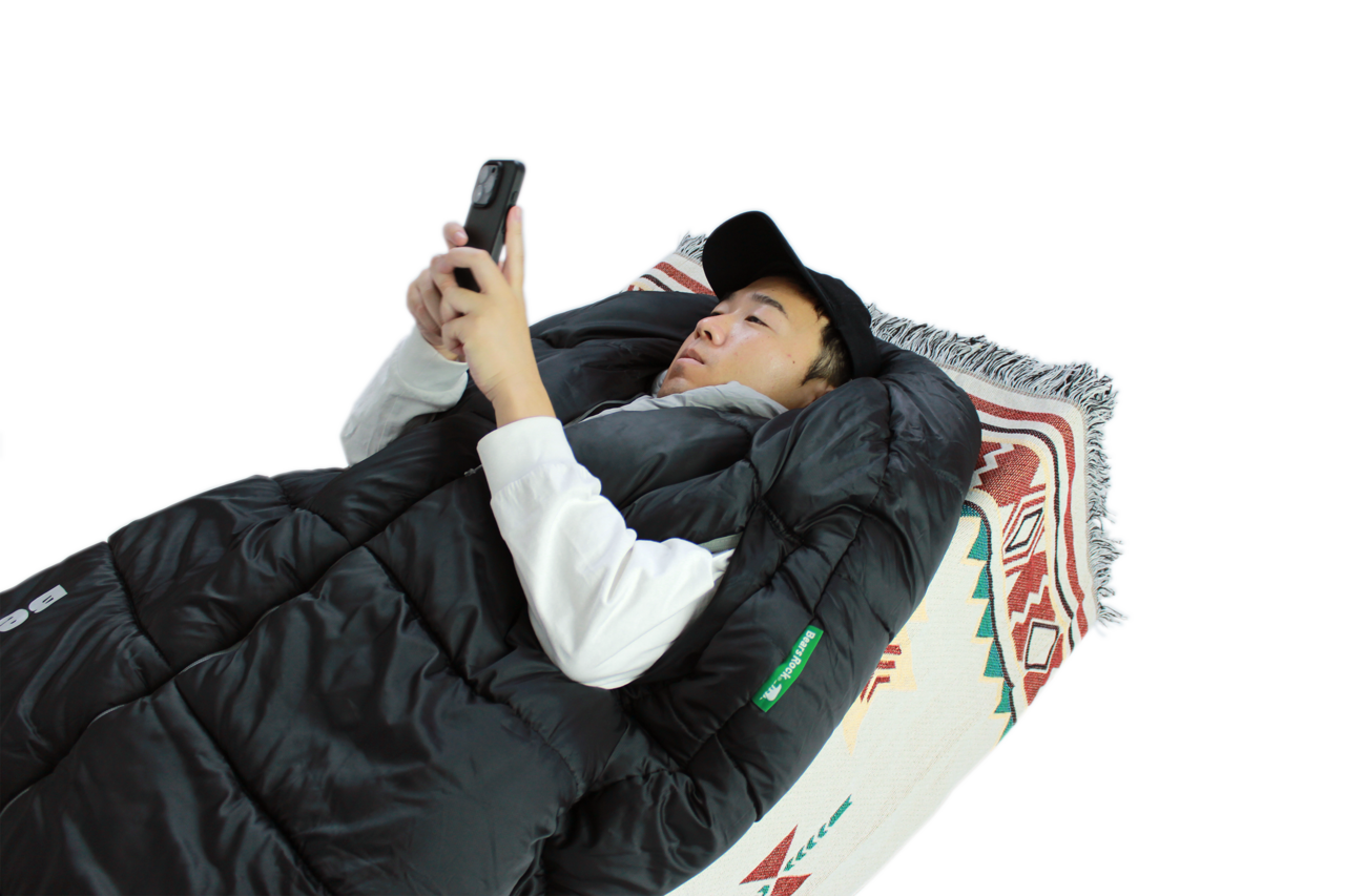 続いて注目したいのがインナーシュラフで、寝袋と一緒に使ったり、ブランケットとして単体使いができたりするなど、アレンジが自由自在。バックル付きベルトでポンチョのようにすればそのままお出かけもできます。