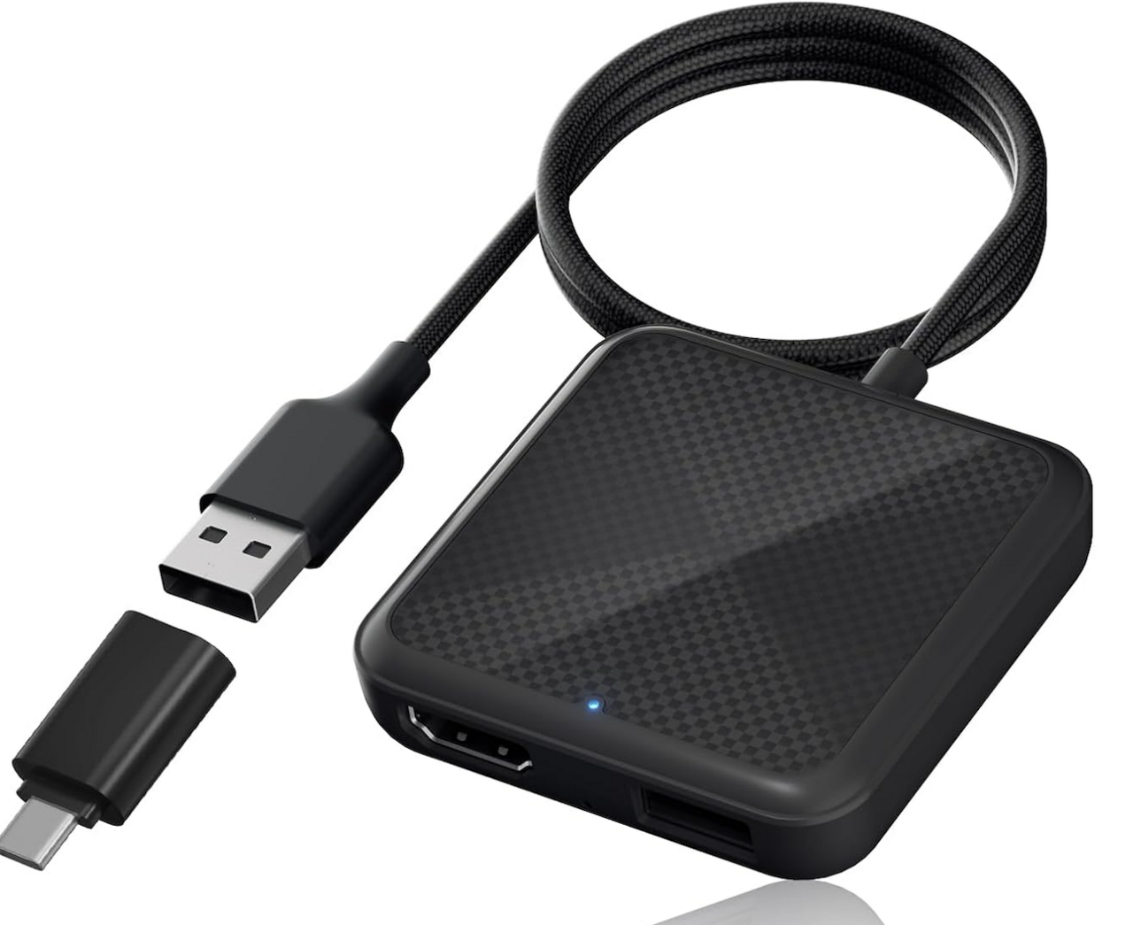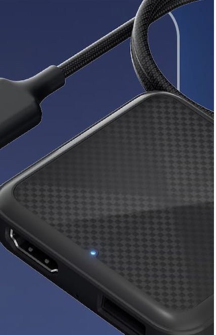 有線CarPlay対応の純正車載ディスプレイを搭載したクルマで使用でき、USBポートに接続するだけで起動。本体にはHDMI入力端子を搭載していて、Fire TV Stickをはじめとした映像機器や一部ゲーム機とスムーズに接続できます。