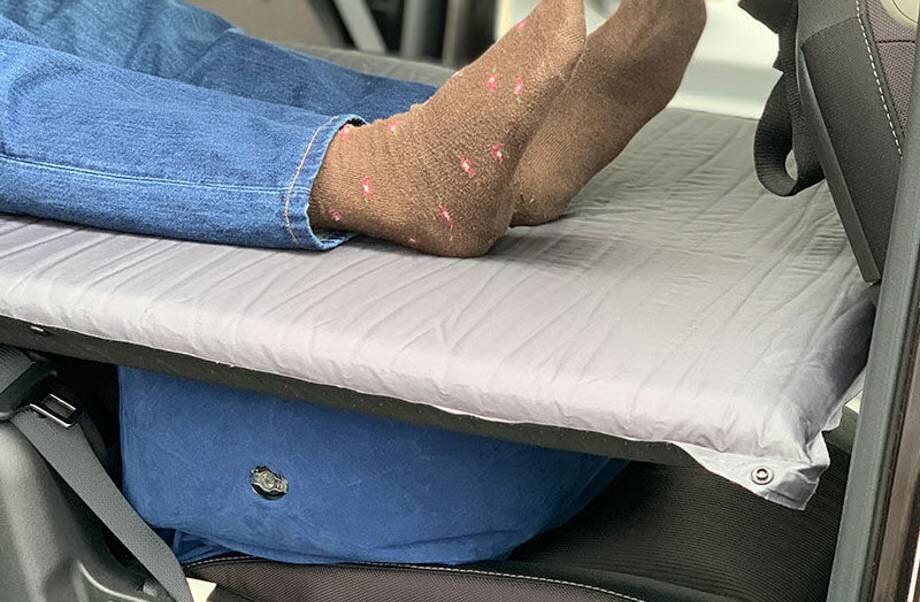 空気室が二つに分かれた構造で、両方に空気を入れてしっかりした足置きにしたり、大きい部屋だけ膨らませてオットマンのように使ったり。小さい方を枕代わりにして、エアベッドと組み合わせれば、フルフラットに近い寝心地をつくることも可能です。