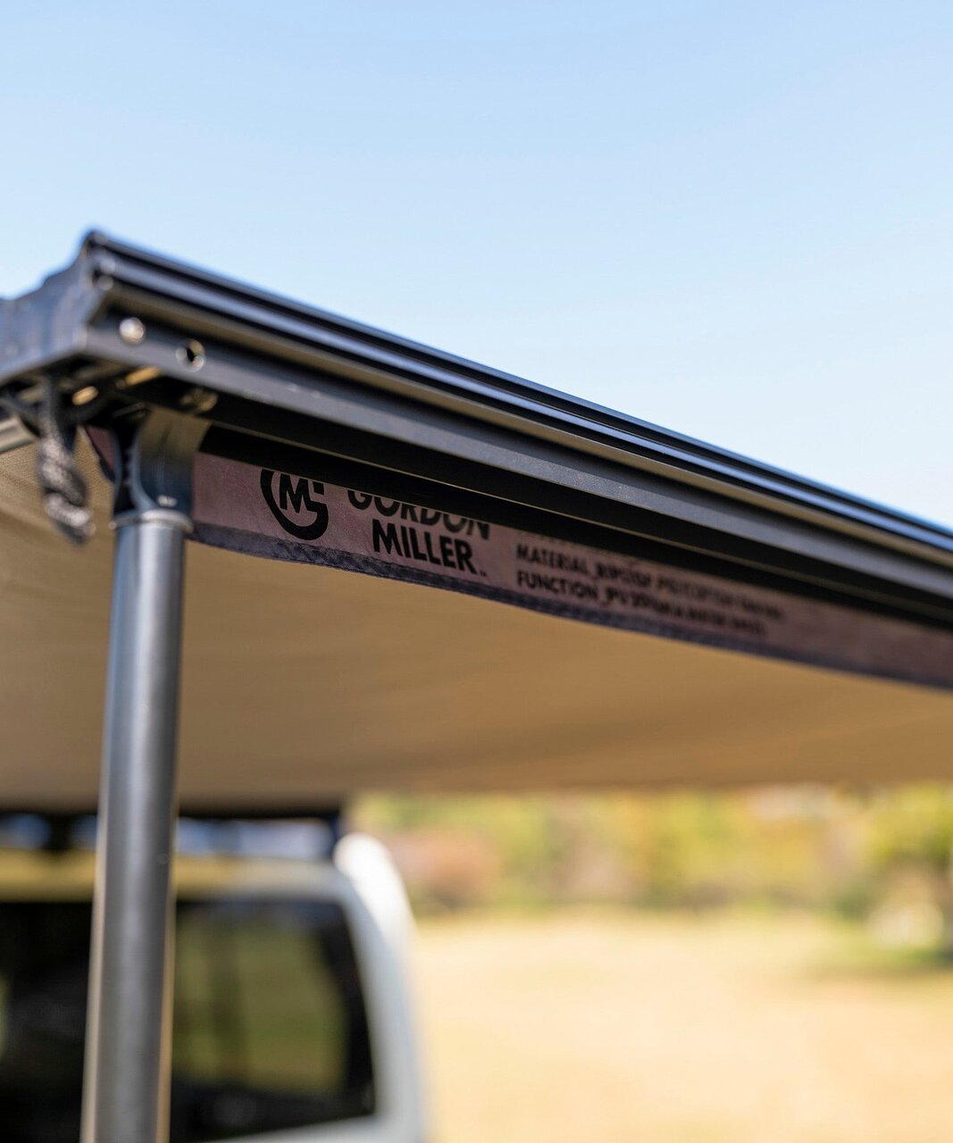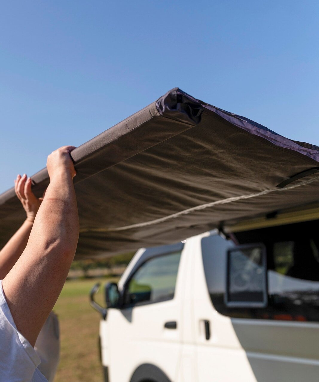 カーサイドに取り付けるストレートタイプのオーニング。高密度なテキスタイルで強い日差しを遮ってくれるだけでなく、一時的な雨からも守ってくれます。1人でも簡単に設営・収納ができるので、到着したらすぐに快適な居住空間を確保できるはず。