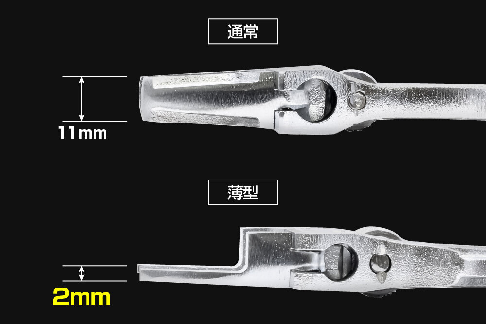 TONE(トネ)の新型モンキレンチは、従来のモンキレンチの悩みどころであった“狭い場所での作業性”を劇的に改善する一本。先端部厚みをわずか2mmに抑えた薄形仕様により、これまで工具が入りにくかった狭窄スペースでもスムーズにアクセス。たった数mmの差が、作業効率と快適さに大きな違いを生みだします。