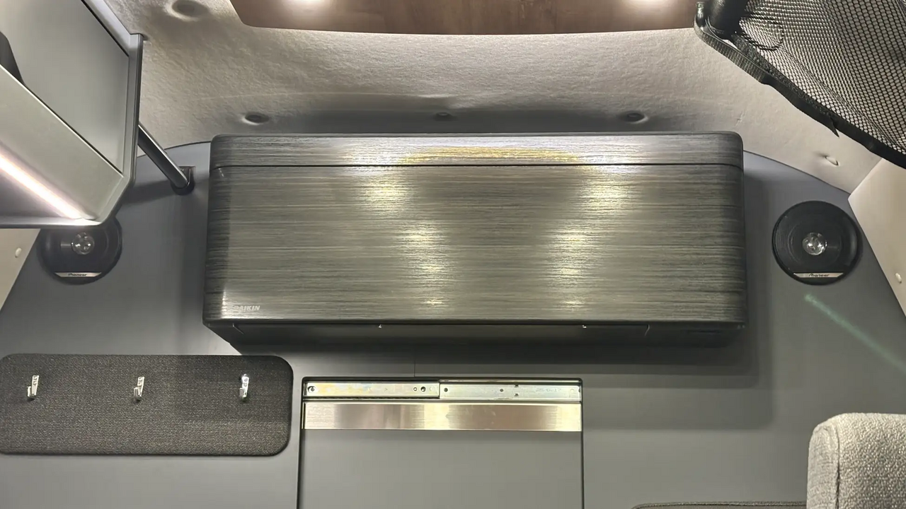 外部電源装置やポータブル電源口も備えることで、エアコンや電子レンジなどの家電も安心して使用可能。エンジン音を気にせず使えるホームエアコンは、静粛性が求められるRVパークやキャンプ場でも重宝し、自宅の寝室に近い感覚で一晩を過ごせます。