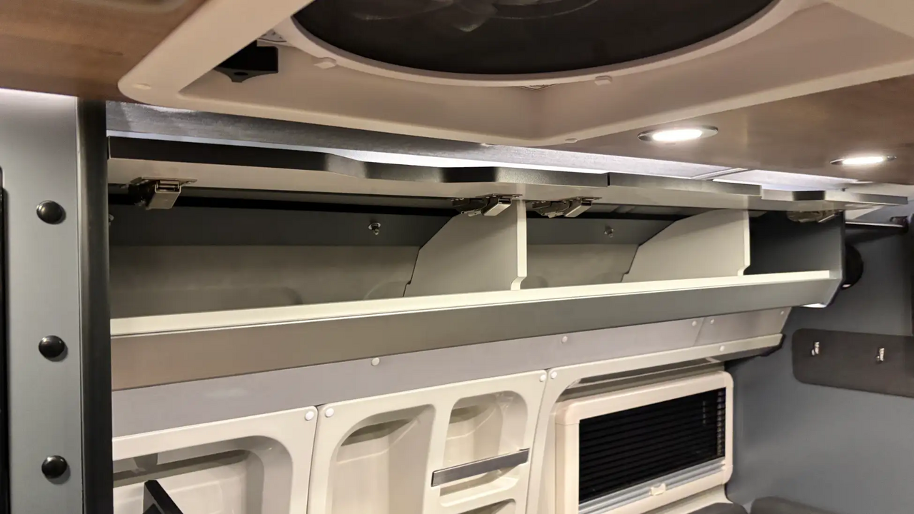 せっかくのキャンピングカー、キッチンと収納にはこだわりたいところ。「RICORSO 7」では、ギャレーエリアに58Lの冷凍室付き冷蔵庫を標準装備し、食材や飲み物をしっかりストックできます。未使用時には作業台として使える蓋付きシンクや、定格2000Wインバーターを生かした電子レンジの配置など、調理と片付けの流れを意識したレイアウトもポイントです。