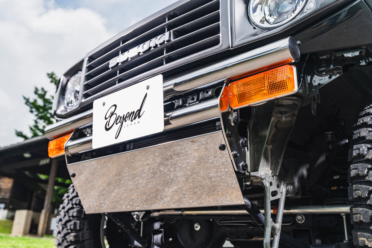フロントバンパーには、JA11純正のスモール&ウインカーランプを採用。角型ランプは現行ジムニーのボディラインとも自然に馴染み、アンバー色のレンズが鏡面仕上げのバンパーに映えることで、どこか懐かしい表情を演出しています。