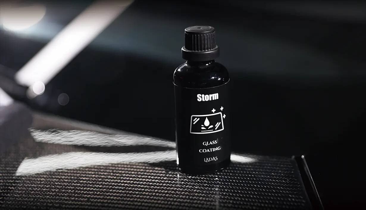 雨が降り出すと、フロントガラスに広がる水の膜や、ライトの乱反射によるギラつきで緊張感が高まります。そこで役立つのが、水滴が玉状になって素早く流れ落ちるガラス専用コーティング「Storm」。ガラス表面に均一で緻密な撥水被膜を形成し、走行中は風圧に乗って水が後方へ弾き飛ばされるようになります。