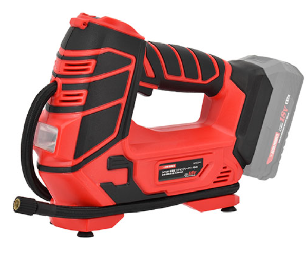 ワールドツールが手掛けるアストロプロダクツの「DC18V 充電式 エアインフレーター IF945」。電源のない場所でも使え、自動でエア充填・停止ができます。