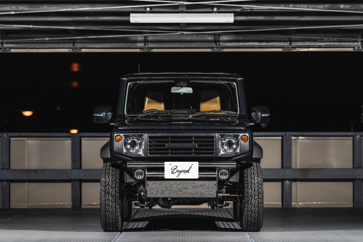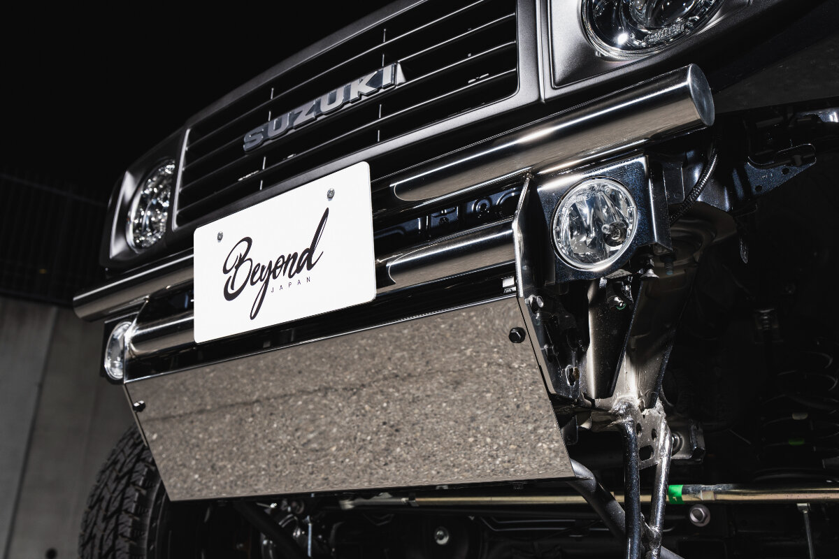 ジムニーシエラのタフな走りを支えつつ、無骨な存在感を発揮してくれるのがビヨンドジャパンのフロント&リアバンパー。定番のブラックカラーのほかに用意されているのが、周囲の景色まで映し出せる鏡面仕上げモデル。磨き込むほど美しい輝きを放つステンレスを採用し、その特性を生かした鏡面バンパーは、存在感と高級感を兼ね備えています。