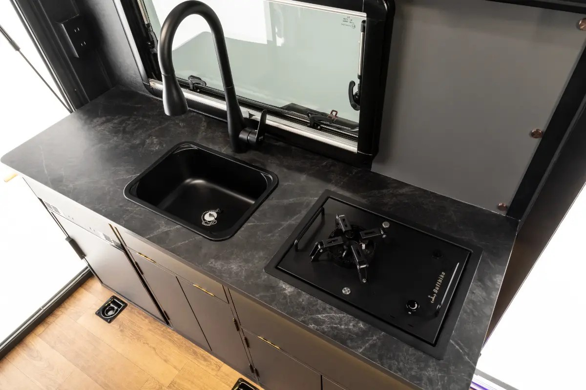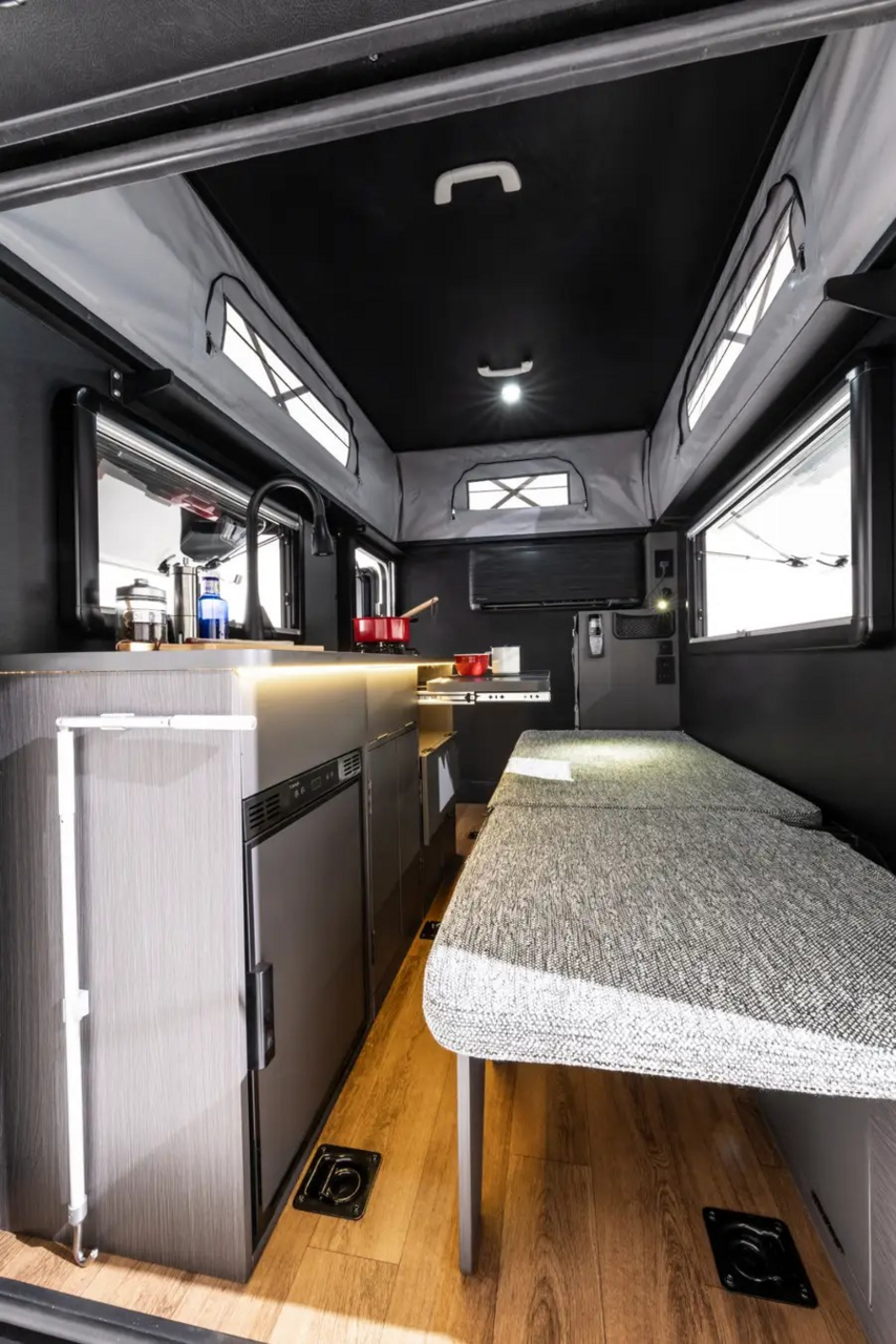 引き出し式テーブルでゆっくりと食事を楽しみ、ポップアップルーフのベッドと折り畳み式のフルフラットベッドでゆっくり眠ることもできます。最大4人が快適に就寝できる設計で、個人の空間を確保しながら旅が可能です。家族旅にもうれしいですね。