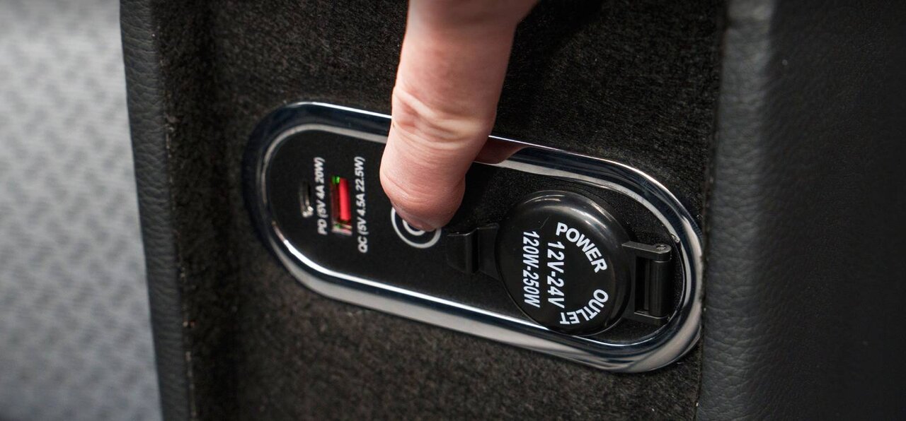 差し込み口が光る仕様になっているので、手探りでポートを探すことなく、スムーズな充電が可能。前方にはタイプA、タイプC差し込み口を各1つずつ配備。スマホやタブレットを同時充電できるほか、シガーソケット差し込み口も配備されているため、ポータブル冷蔵庫などの家電も使えます。日常のドライブから車中泊まで、あらゆるシーンで重宝すること間違いなしです。