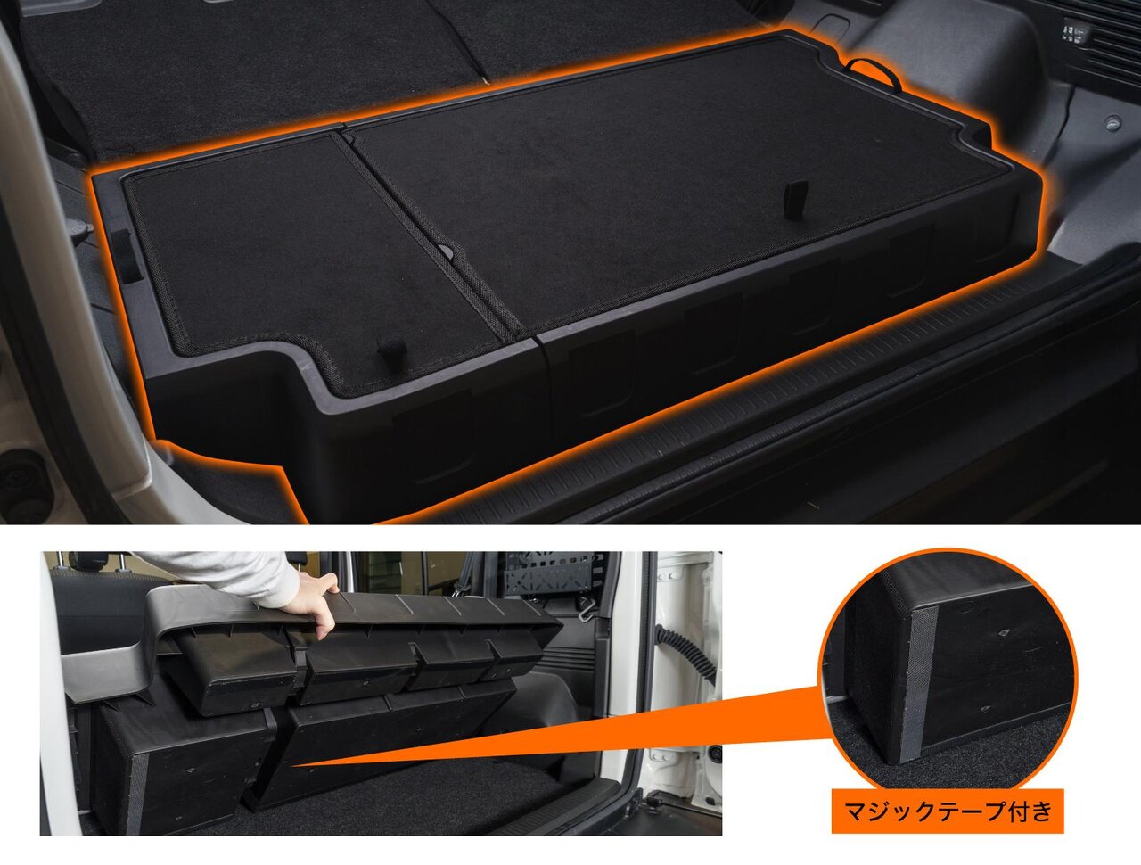 取り付け作業に複雑な工程や特殊な工具は一切なし。ラゲッジ部分にある凹凸に合わせて本体をはめ込み、付属のマジックテープで固定するだけで完了します。