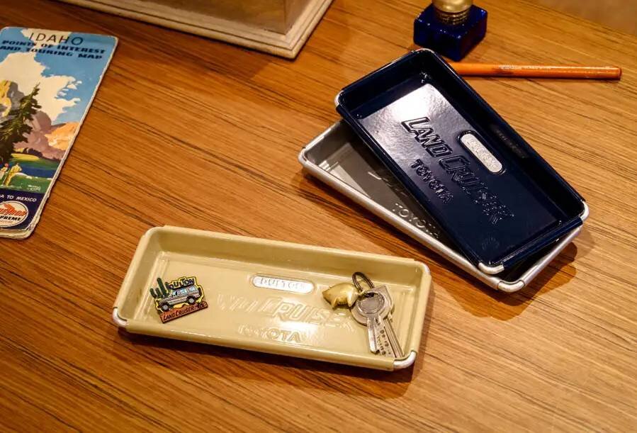 文房具やクルマのキー、時計やアクセサリーなどを置くのに便利な卓上サイズの「DESKTOP TRAY(デスクトップトレイ)」。エンボスで施されたLAND CRUISERロゴ上に、別パーツで製作したDULTONロゴプレートを埋め込んだオリジナルデザイン。こちらもランクル70に採用されてきたカラーを忠実に再現した別注色の3色展開です。