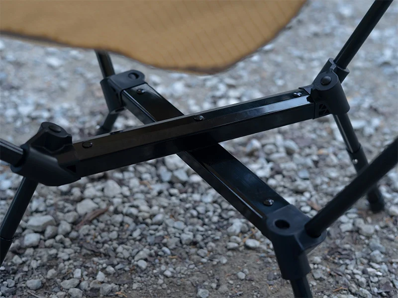 コンパクト化で落ちた強度を支えてくれるのが、座面下のX型フレーム構造。高強度アルミ合金フレームと、210Dナイロンに超高分子ポリエチレン(UHMWPE)を織り込んだ強化ファブリックを採用。静止耐荷重は130kgと、旧モデルの80kgから大幅に向上しました。