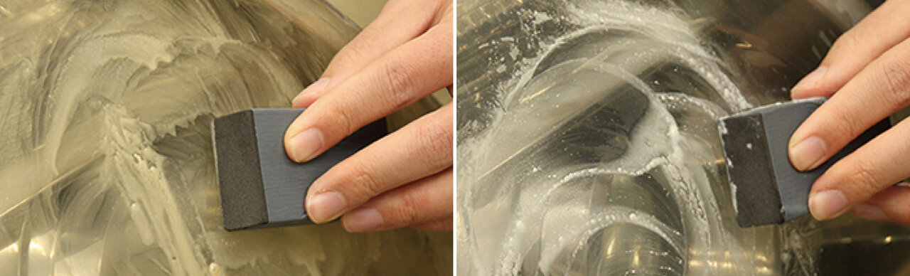 「復活王 黒樹脂用」は研磨いらず。スポンジでコーティング液を塗り込み、クロスで拭き上げるだけで完了です。独自のプライムリペア成分が、紫外線で荒れた樹脂表面の微細な凹凸を埋めて滑らかに。