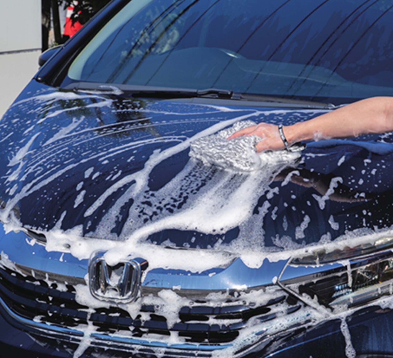 たっぷり泡でやさしく洗う「マイクロファイバー洗車パッド」は、極細繊維による高い保水力で、シャンプー液をしっかりキープ。豊かな泡でボディをやさしく洗い上げます。ストラップ付きのため、使用中の落下を防止。洗車後は吊り下げて乾燥・保管が可能です。