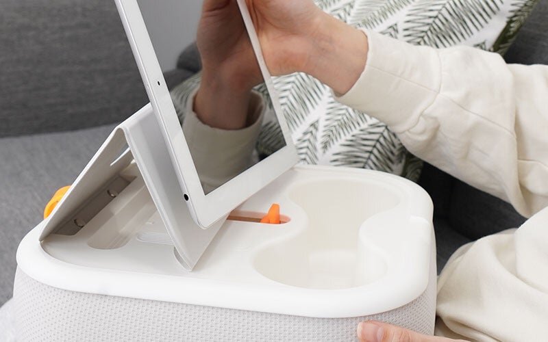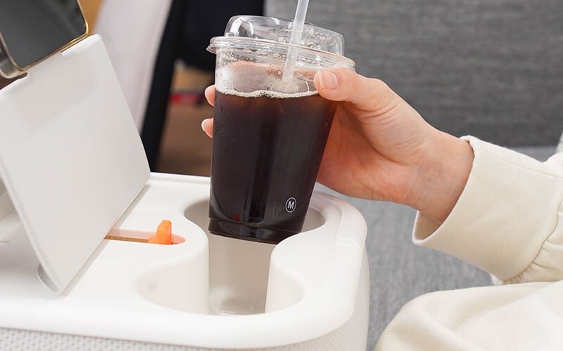 スマホスタンドやドリンクホルダー、そして安定感のある簡易テーブルが完備で自分の膝上が「動かなくていい特等席」に早変わり。スマホスタンドにはマグネットが入っているので大きめのタブレットも固定できて、後付けのリングを取り付ければ幅広い端末で使用可能です。