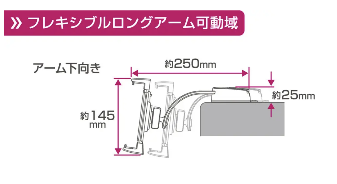 全長300mmのロングフレキシブルアームは、力を込めて曲げることで、車種ごとの複雑なインパネ形状や、自分にとってのベストポジションに合わせることができます。さらに、ホルダーの付け根には360度回転するボールジョイントを装備。縦画面でのナビゲーション、横画面での動画鑑賞など、その時の気分や用途に合わせて、瞬時に角度を切り替えられます。