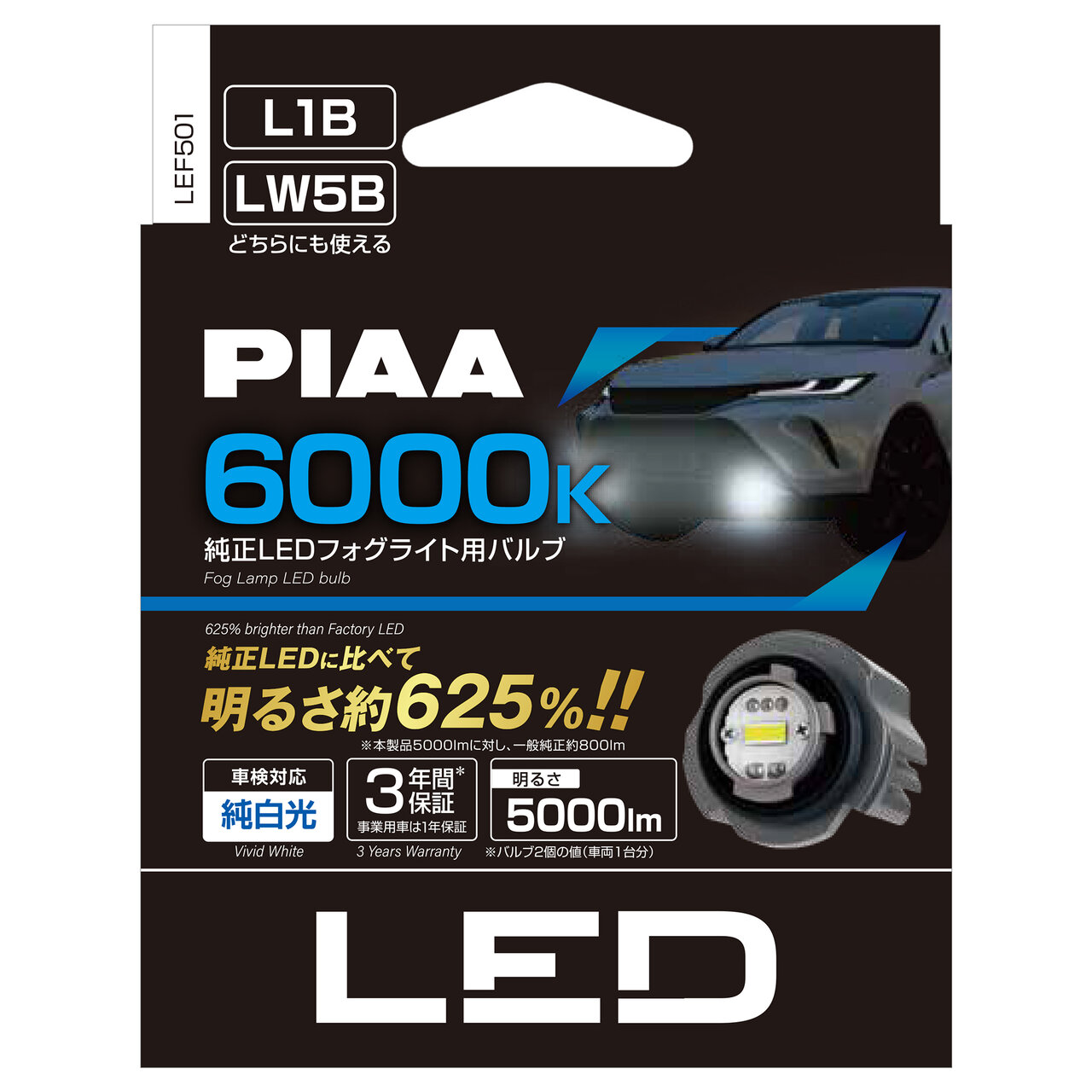 一般的な純正バルブ(800lm)と比較して、約625%となる5000lmの明るさを誇るフォグランプ用LED。天候や路面状況に合わせて、6000K(ホワイト)と2500K(イエロー)を自在に切り替えられるので、路面状況に左右されず、安全なドライブをサポートしてくれます。
