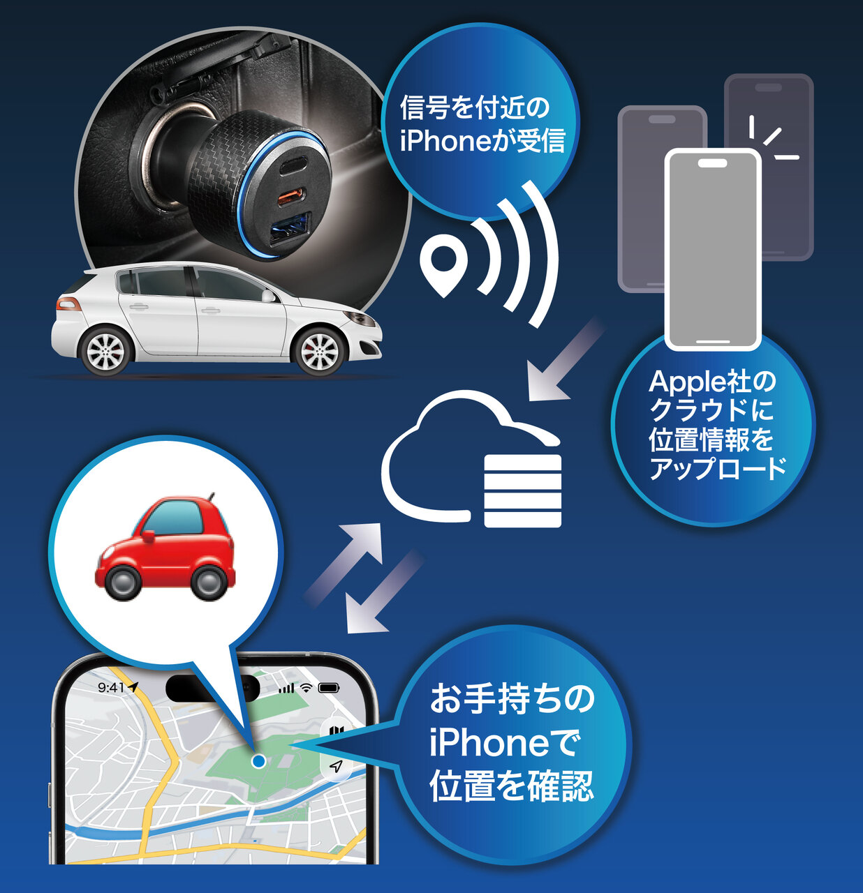 カーメイトから続々リリースされている、クルマの追跡&急速充電ができるiPhone用カーチャージャー。iPhoneやMacでおなじみの「探す」アプリに対応し、Bluetooth信号を通じて車の位置を特定。iPhoneに標準搭載されているアプリをそのまま使うため、月額料金や専用ソフトの導入は一切必要ありません。