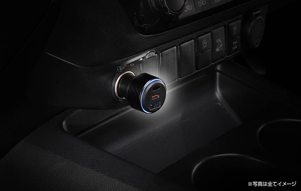 デザインは、スポーティーなカーボン調と落ち着いたブラックの2種類。通電時にはLEDリングがブルーに輝き、動作状況をひと目で確認できます。車内インテリアを壊さないから、どんな車種にもフィットしそう。