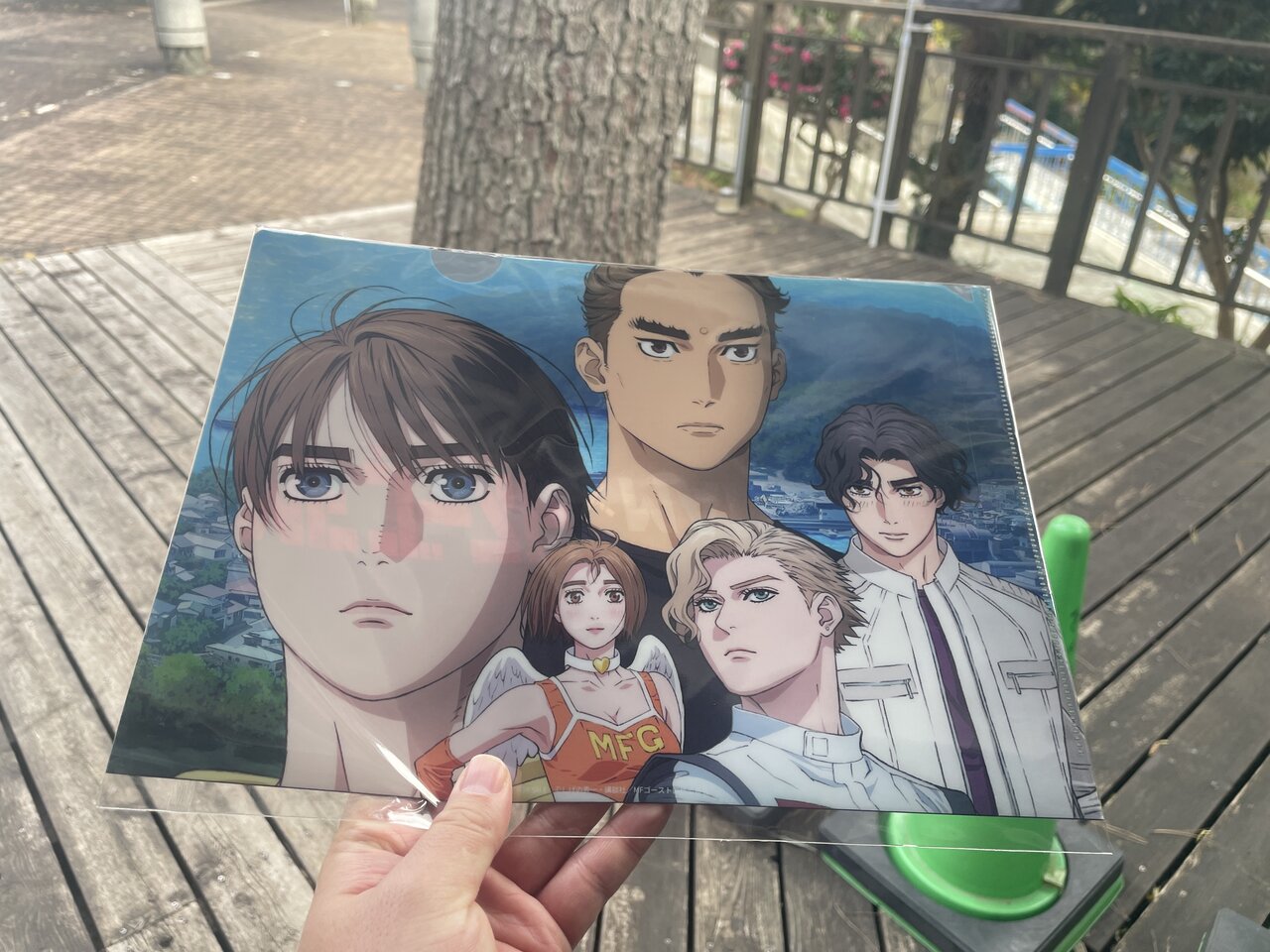 景品の引き換えは受付場所の「お林展望公園」「真鶴駅前観光案内所」「真鶴町観光協会」で行うことができ、コンプリートではなくても6つ集めるとクリアファイルをもらえます。ちょうどお林展望公園で6つのスタンプが集まったので、一旦交換してみました。クリアファイルは真鶴の風景をバックに主要キャラクターの顔がデザインされたものになっています。