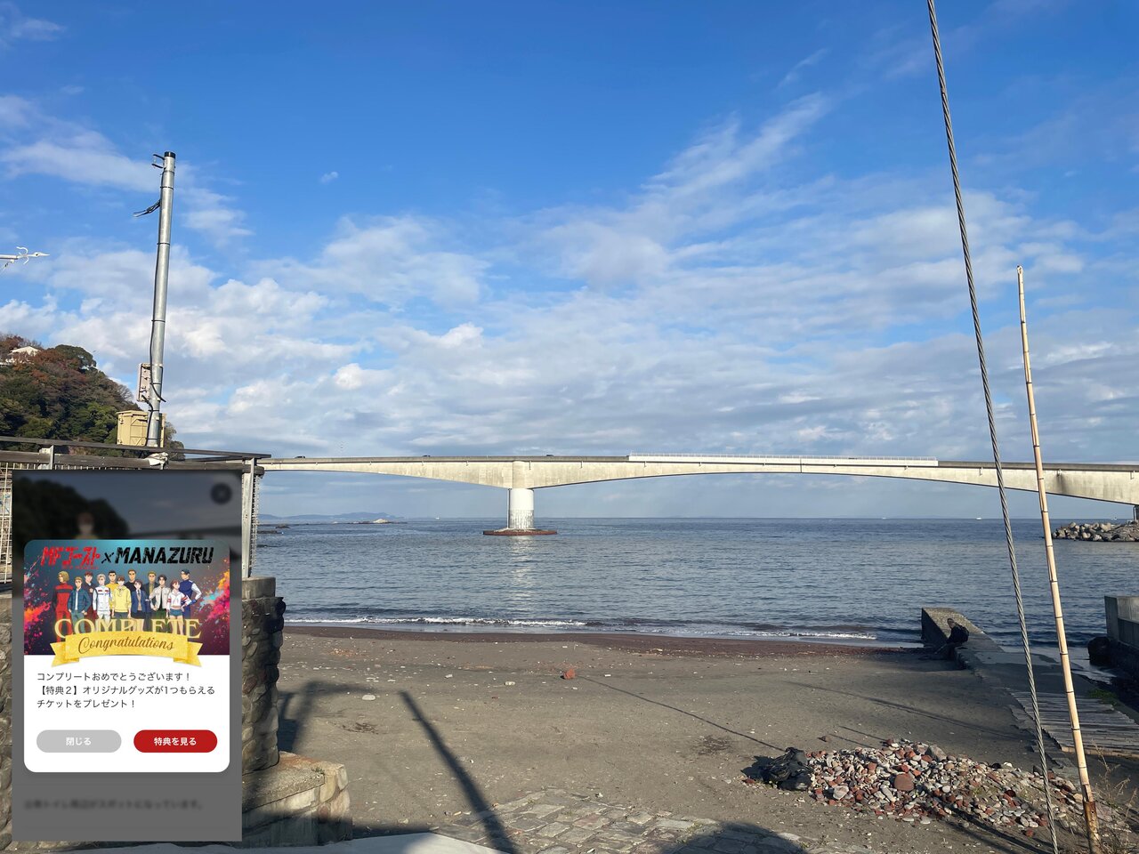 最後は岩大橋を一望できる「岩海岸」でコンプリート達成!アニメのオープニングに出てくるような良い景色で、こんな場所があるとは知りませんでした! 今回スタンプラリーへの参加で、これまで見ることがなかった真鶴の景色を楽しめて、新たな魅力を発見できました。