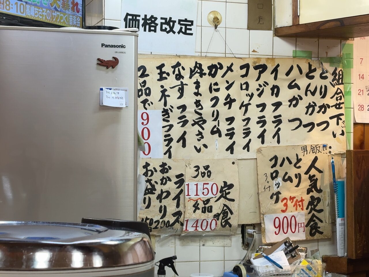 11時になり、入店。V字型のカウンターと小さなテーブルが迎えてくれ、お茶や箸をセルフで用意するスタイルが懐かしい定食店らしさを感じます。壁に並ぶ年季の入った手書きメニューが、この店の歴史を物語っていました。