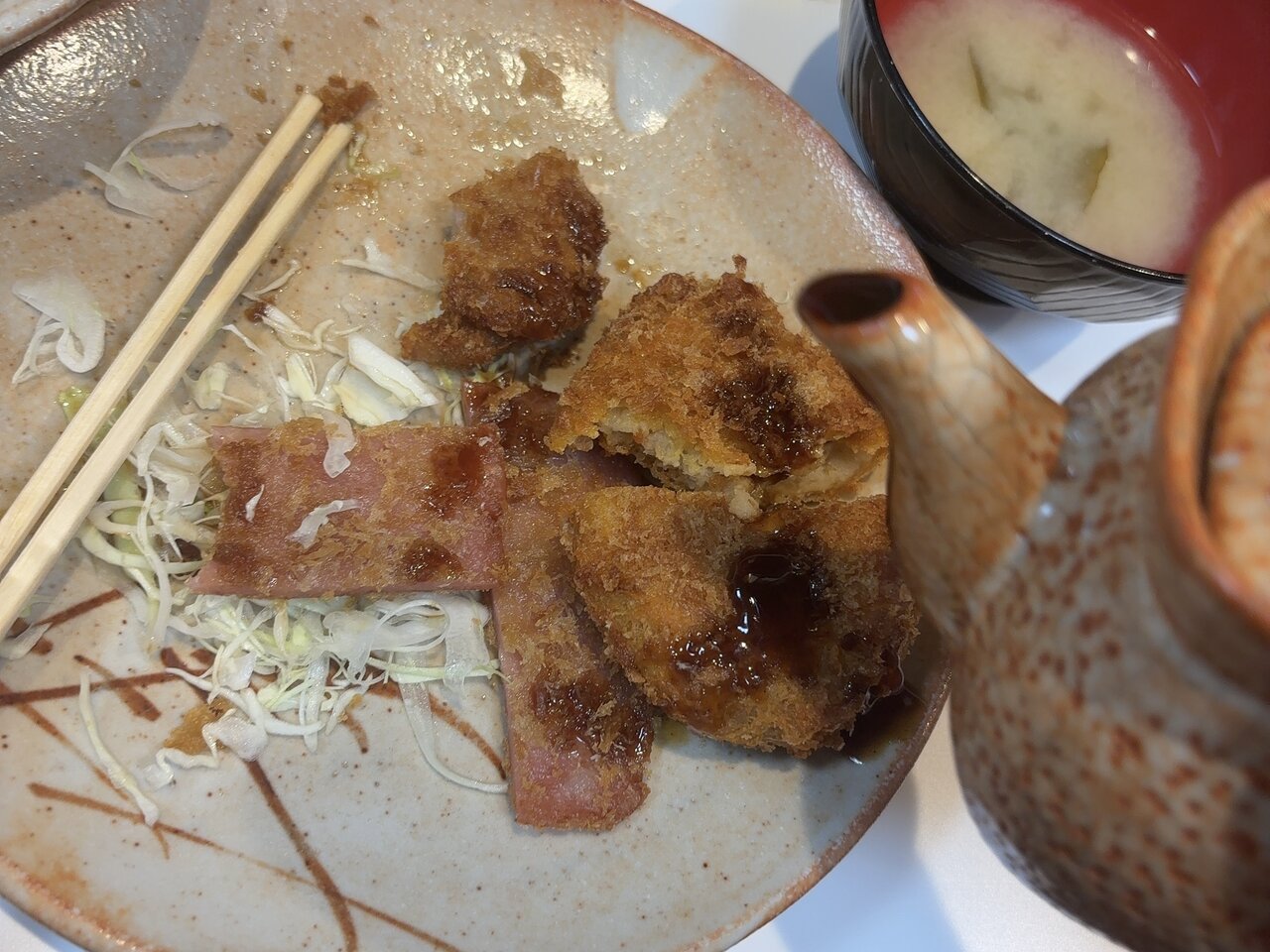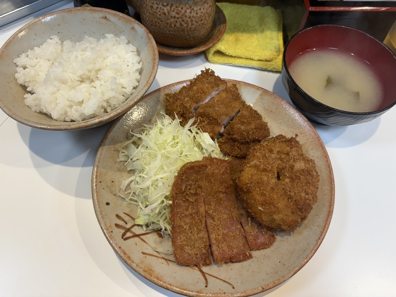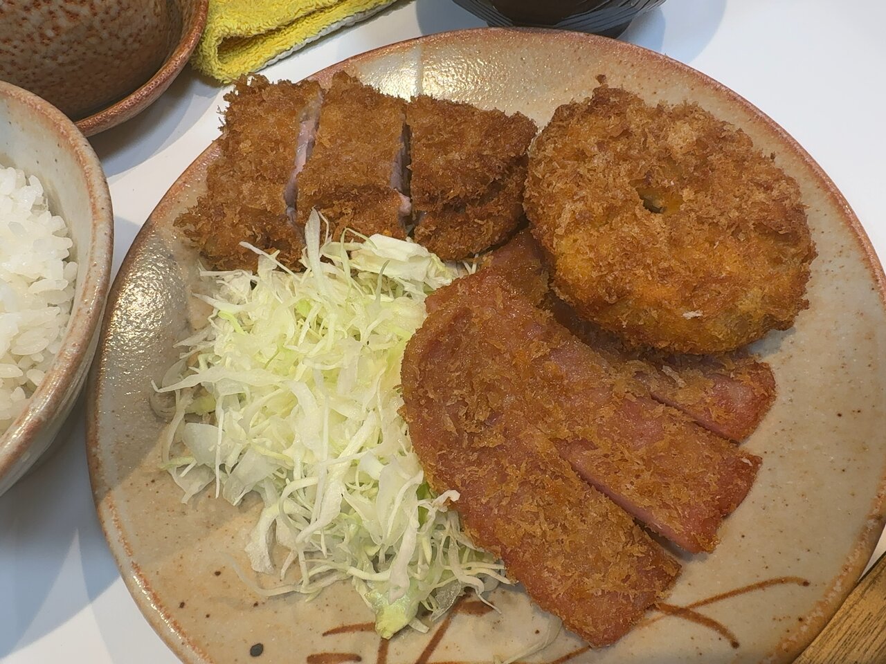 今回は、とりかつ・ハムかつ・コロッケが一度に楽しめる「人気定食」を注文。揚げたてが運ばれてきた瞬間、衣の香ばしさと立ちのぼる湯気に思わず唾を飲み込みました。