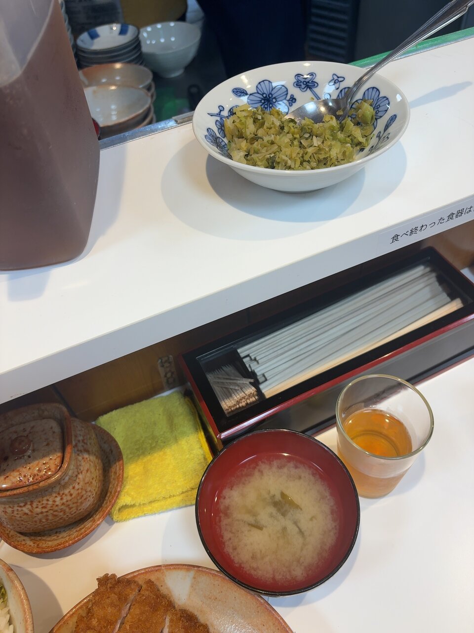 揚げたての揚げ物に夢中になっていると、カウンター越しに女性スタッフの方から「よかったら、この漬物もご飯にのせて食べてみて」と声をかけていただきました。お皿に盛られた素朴な漬物を白ご飯にのせると、揚げ物のコクを引き立てながら、口の中をすっきりさせてくれる絶妙な存在に。