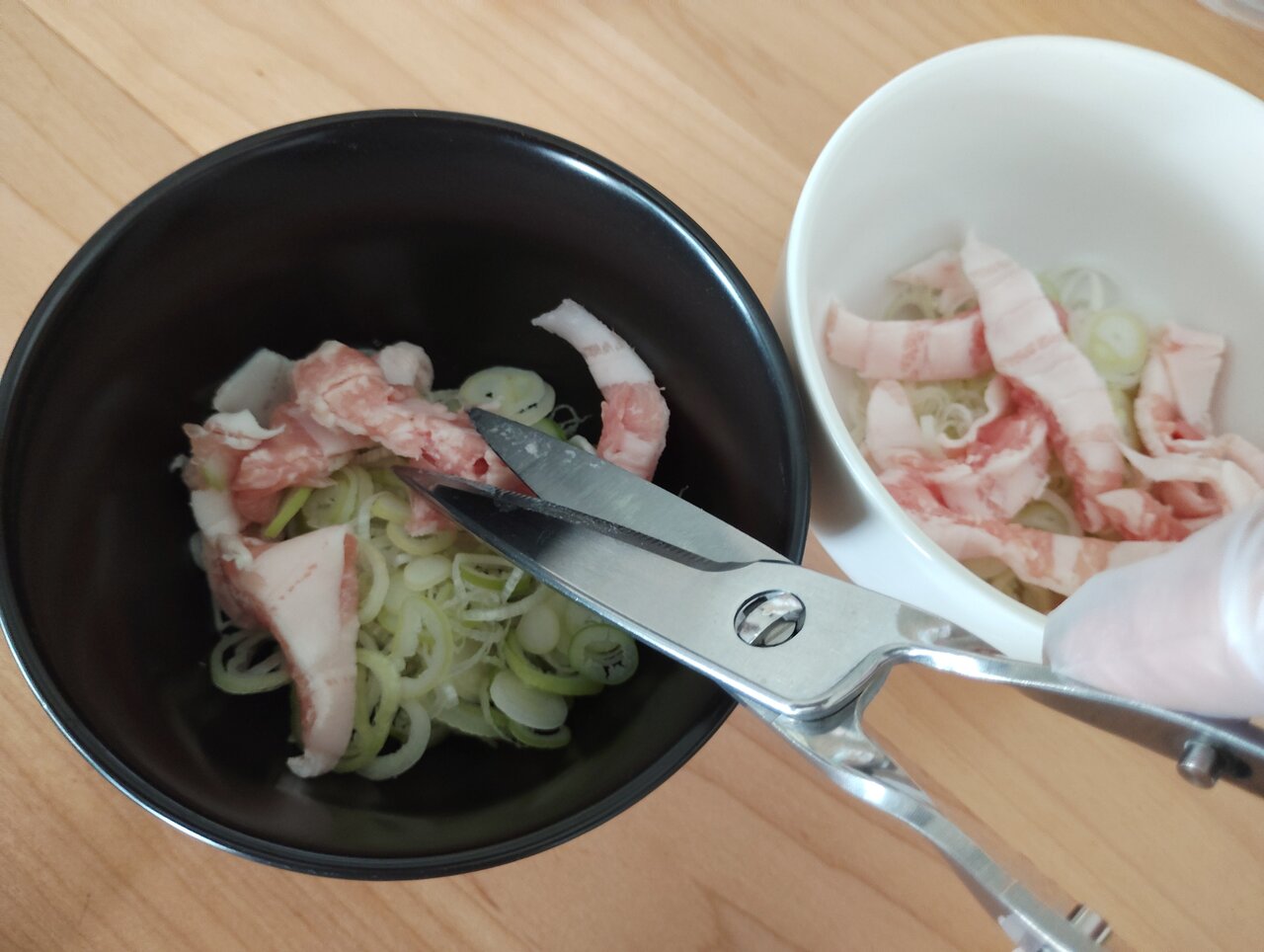 スープが入る深めの耐熱容器に刻みねぎを入れ、豚バラ肉をキッチンバサミで細めに切りながらねぎの上に入れます。