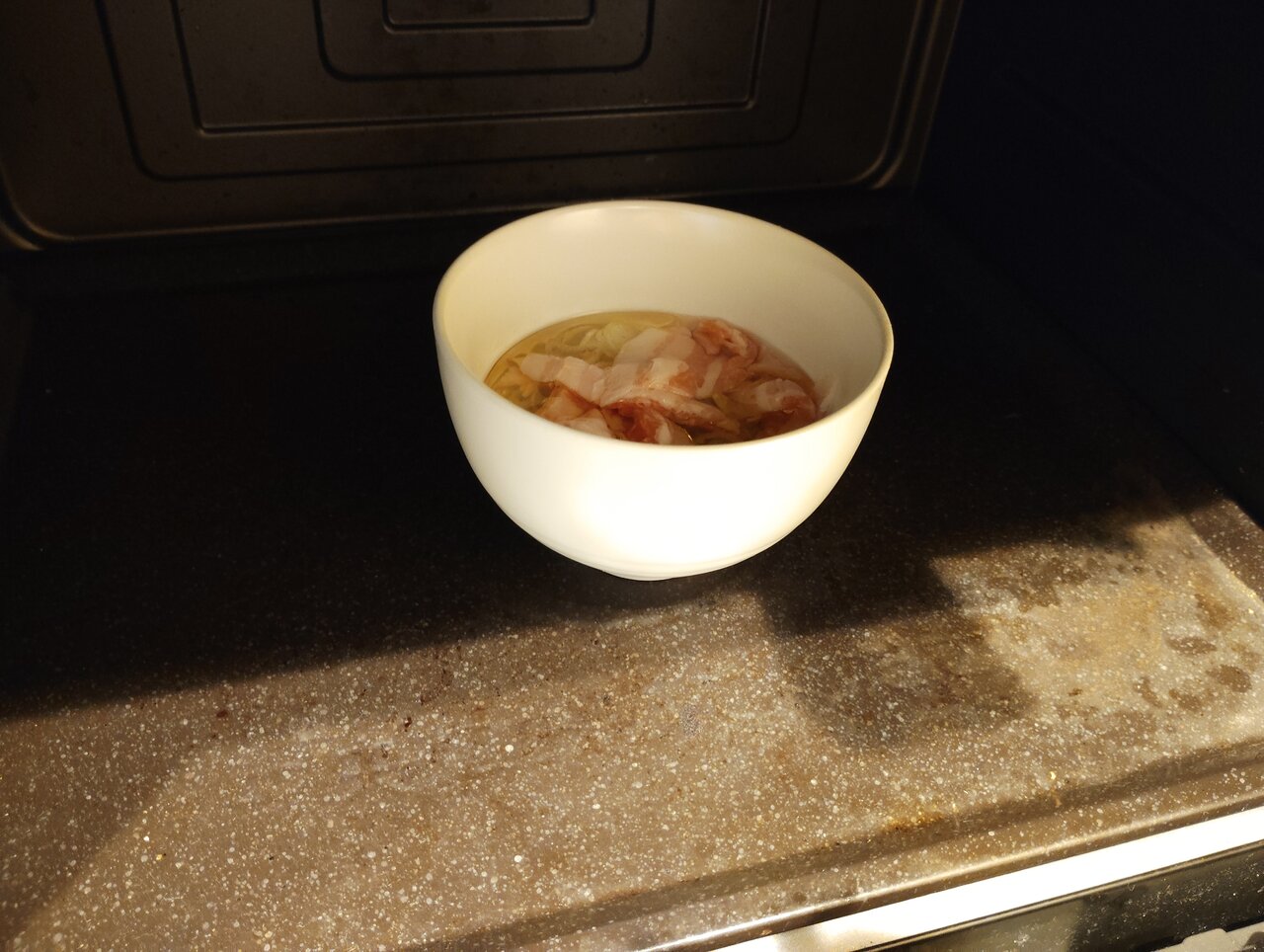 1.耐熱どんぶりに刻みねぎと豚バラを入れる