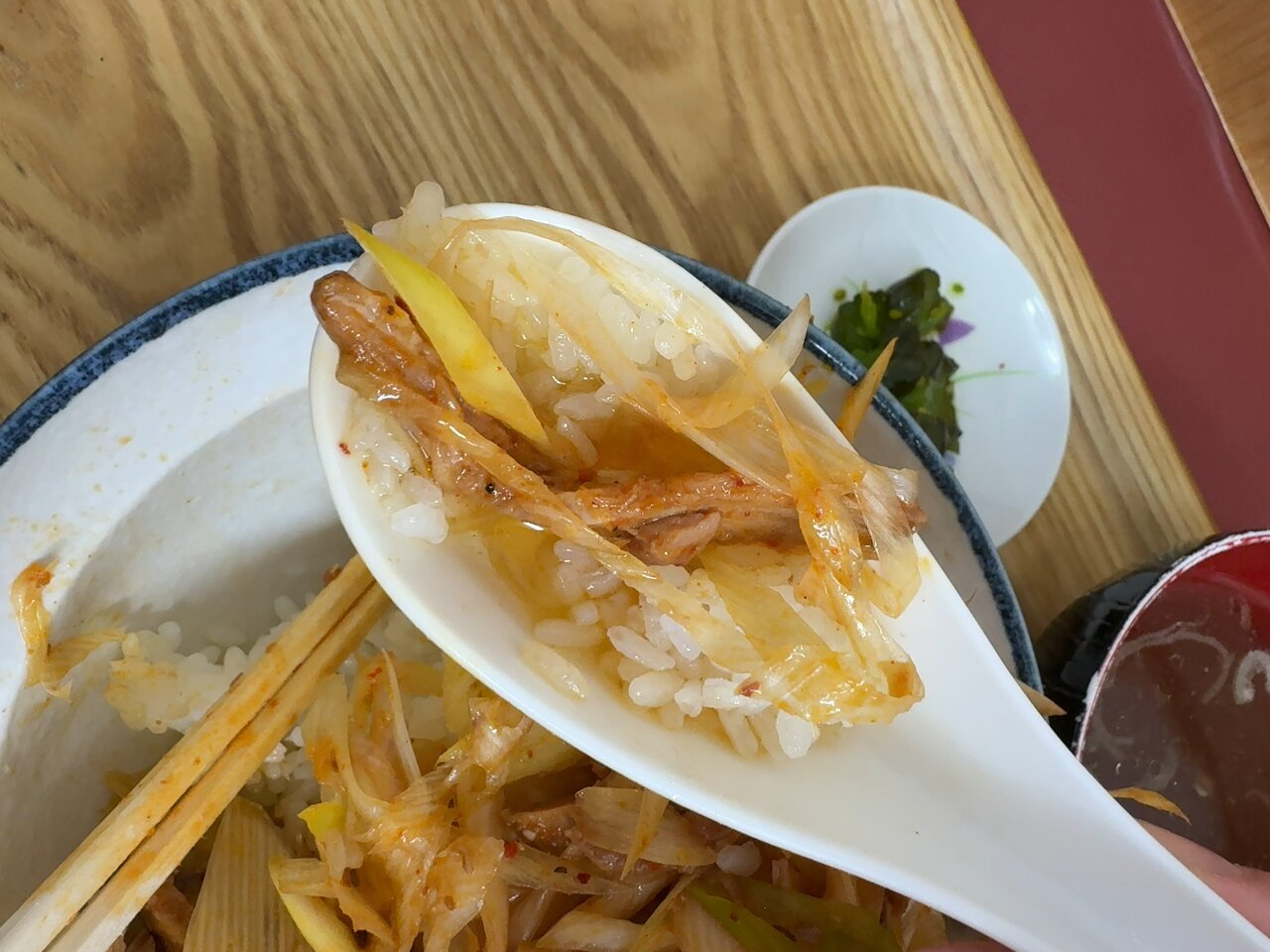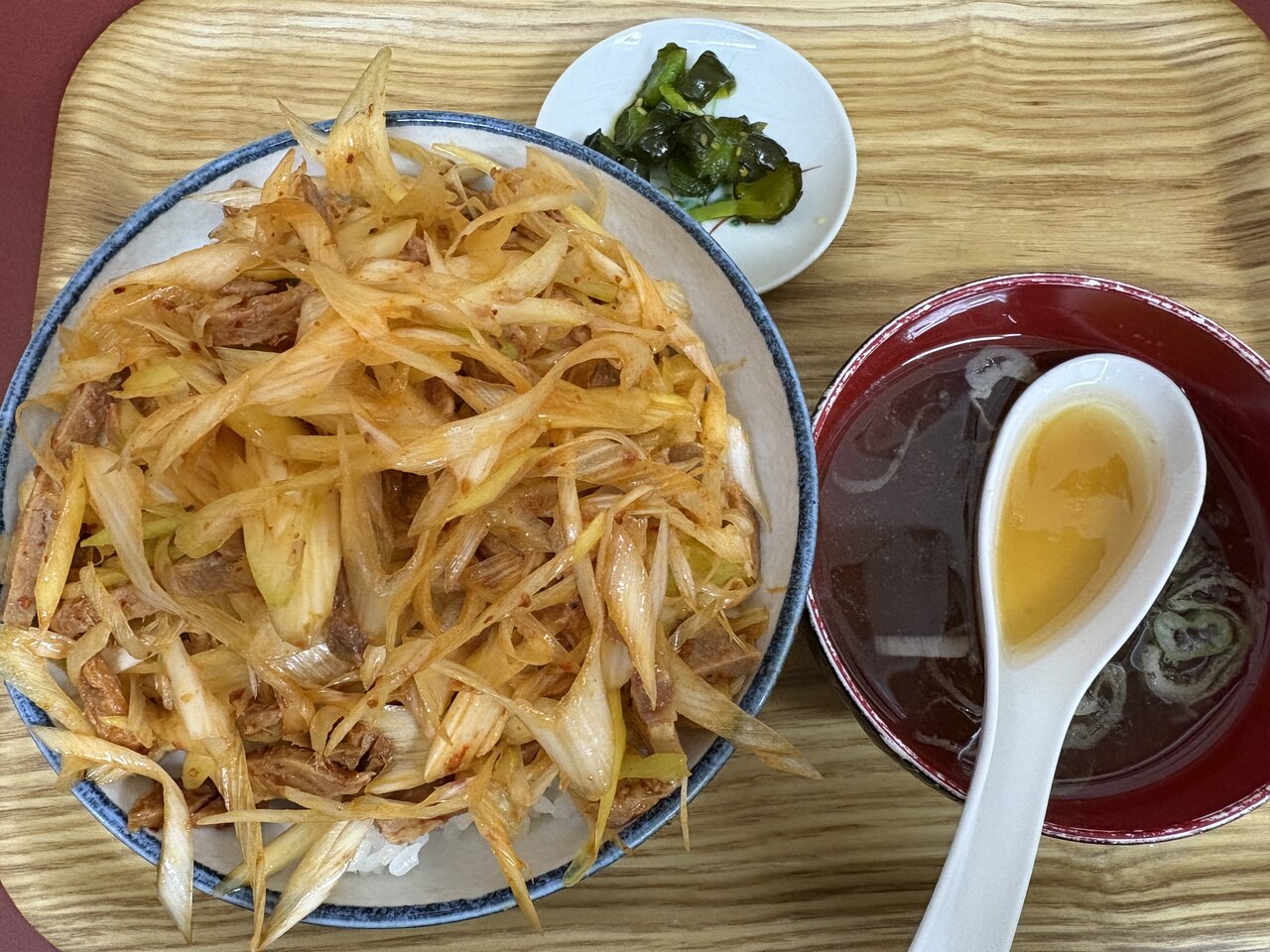 丼の中には、こぼれ落ちそうなほど山盛りの白ねぎと薄切りチャーシュー。ねぎは、シャキシャキとした食感が心地よく、豆板醤ベースのタレがほどよく絡みます。ほんのりピリッとした辛味がアクセントになっていて、辛いものが苦手な方でも美味しく食べられそう。