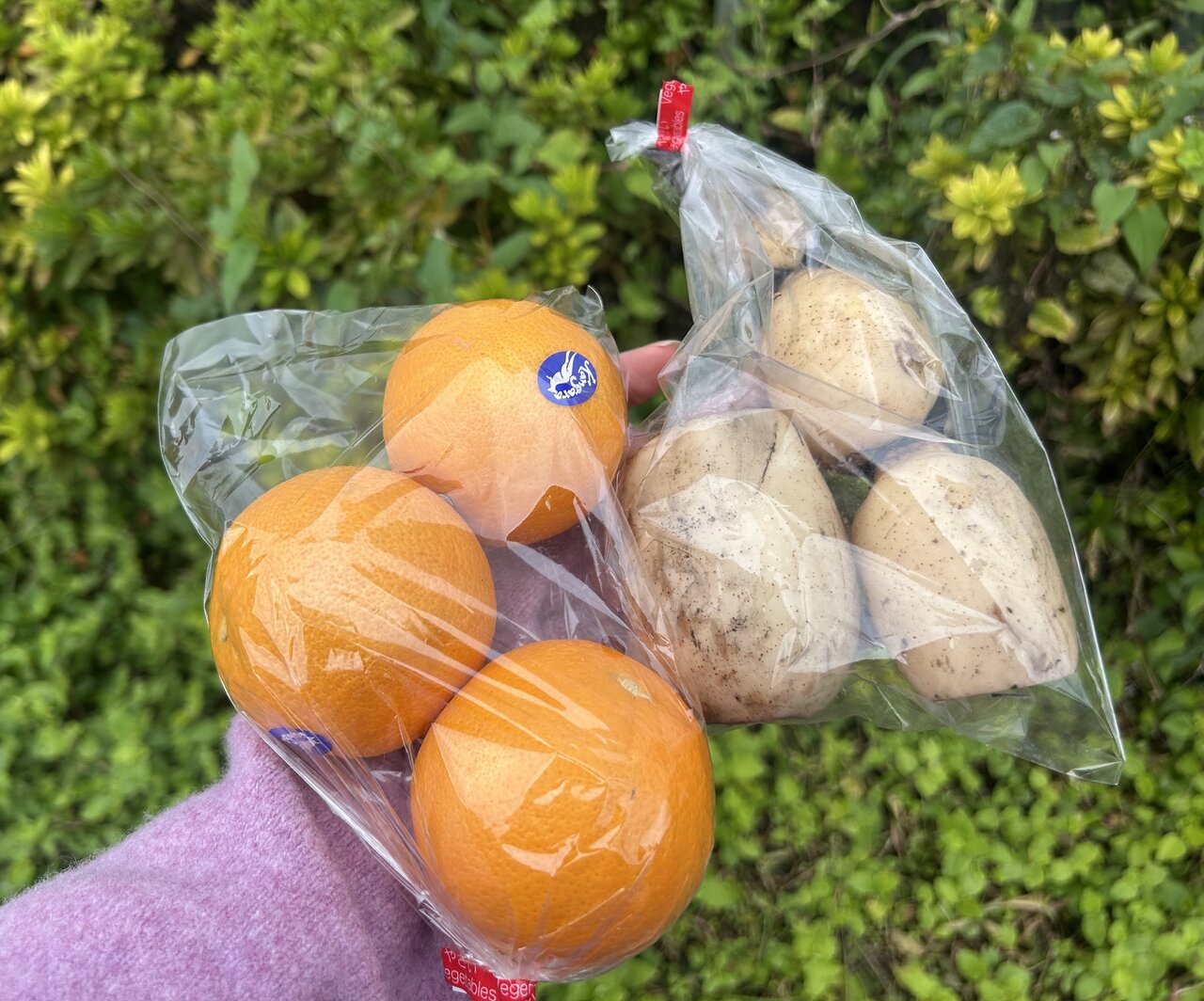 ついでに買い物も。旬の食材が並んでいる中で、オレンジとレンコンをゲット。どちらも美味しそうですが、なんと合わせて200円という信じられない安さ! 掘り出し物を見つけ出した高揚感を味わえました。