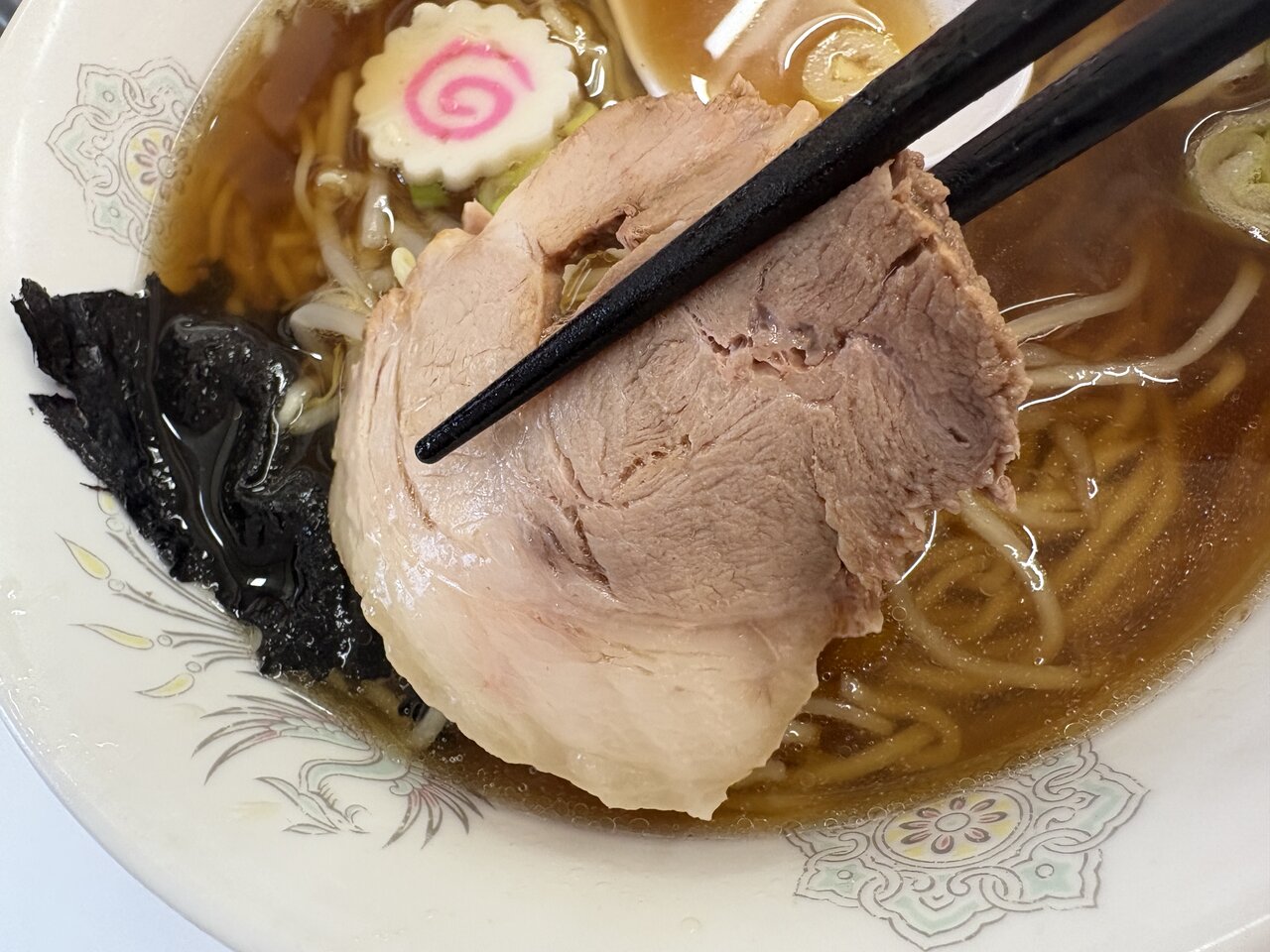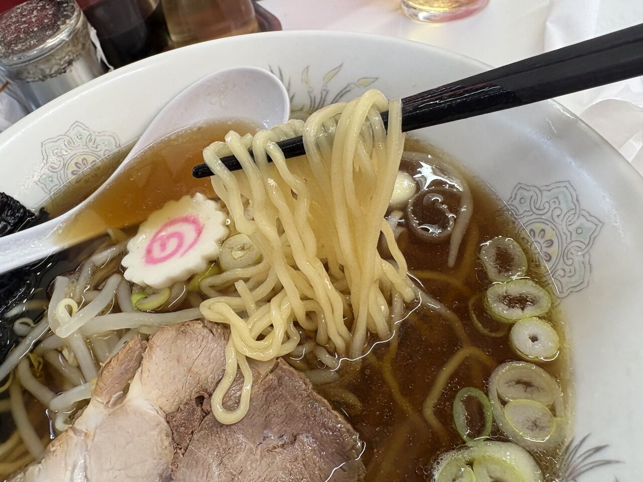 そして運ばれてきたラーメンは、見た目にもどこか懐かしさを感じさせます。澄んだ醤油色のスープに、ほどよく油が浮かび、中央には大きめのチャーシュー。もやし、刻みネギ、海苔、そしてナルト。街中華のラーメンとして、理想的な内容です。