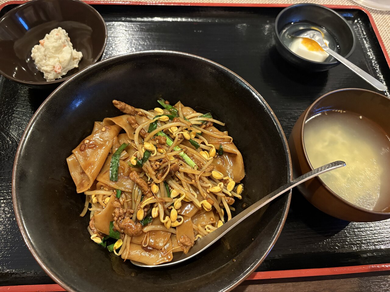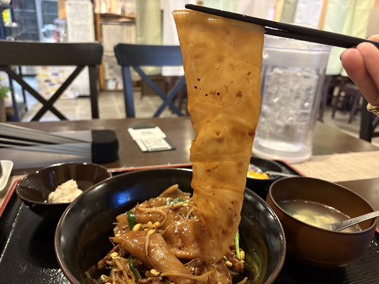 具材は、豆もやしとニラ、そして肉というシンプルな構成ですが、幅広麺との相性は良く、噛みしめるほどに満足感が増していきます。すすって食べるというよりも、噛みしめながら味わう一杯です。