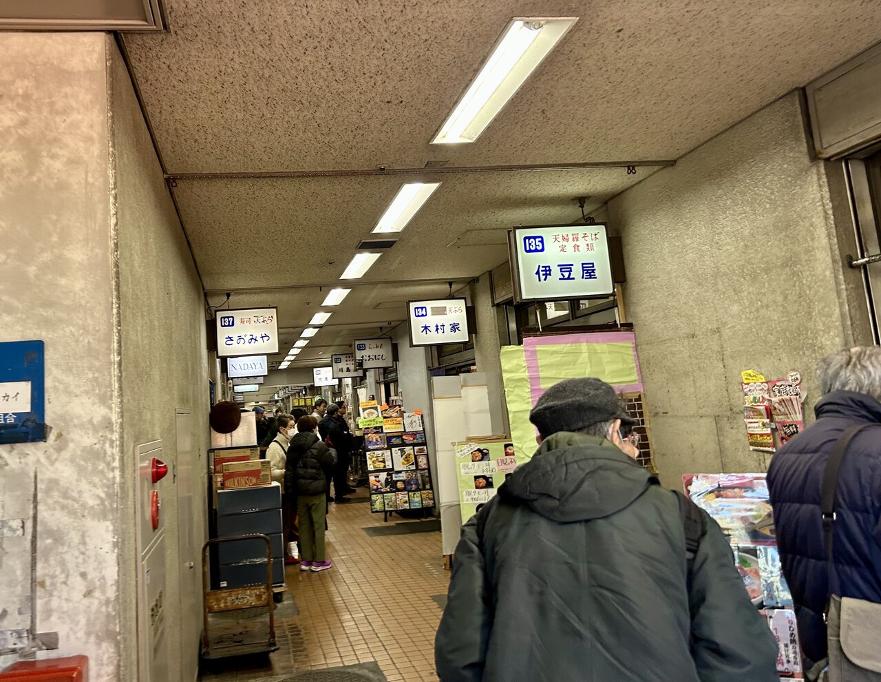 飲食店が立ち並んでいるのは、関連棟。こちらには15軒ほどの飲食店が立ち並んでいます。平日の昼間に立ち寄ったものの、想像以上に大混雑! 立地で考えると近くのビジネスマンが多いのかと思っていたのですが、意外にも遠くからわざわざ来たであろう観光客の姿が目立ちます。特に寿司店などは長い行列ができていて、思った以上に活気がある雰囲気です。