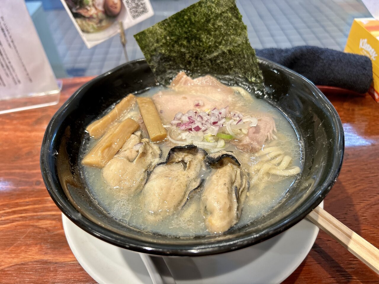 そうこうしているうちに、出来上がりの呼びだし! 待ちに待った「牡蠣塩ラーメン」(1680円)。なんとも贅沢に、ぶりの牡蠣が3つもトッピングされています。くぅ……牡蠣好きとしてはたまらないビジュアル。待っている間に公式インスタを見て知ったのですが、トッピングされている海苔はタレントの出川哲朗さんの実家として有名な蔦金商店から仕入れているのだそう。