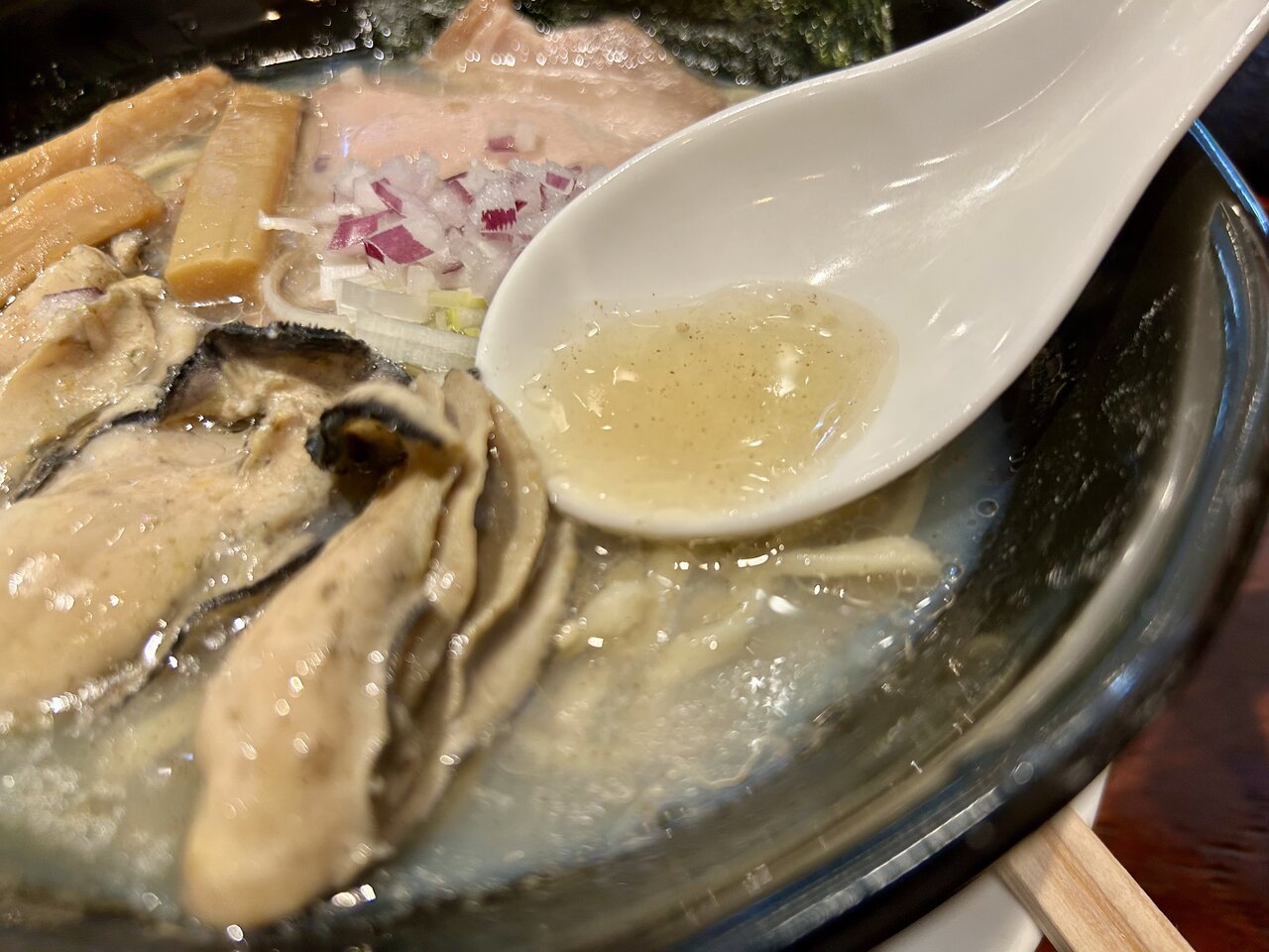そして、待ちに待った牡蠣に取りかかります! 1口食べると……濃厚な磯の旨味が弾けました。パンチのある牡蠣エキスが、頭を突き抜けていきます……。おっと、あまりの幸福感に思わず箸が止まってしまいました。この濃厚な余韻を残しつつラーメンをいただくと、先ほどの「牡蠣塩ラーメン」がより一層深みのある味に変化。なんという至福のラーメンなのでしょう。