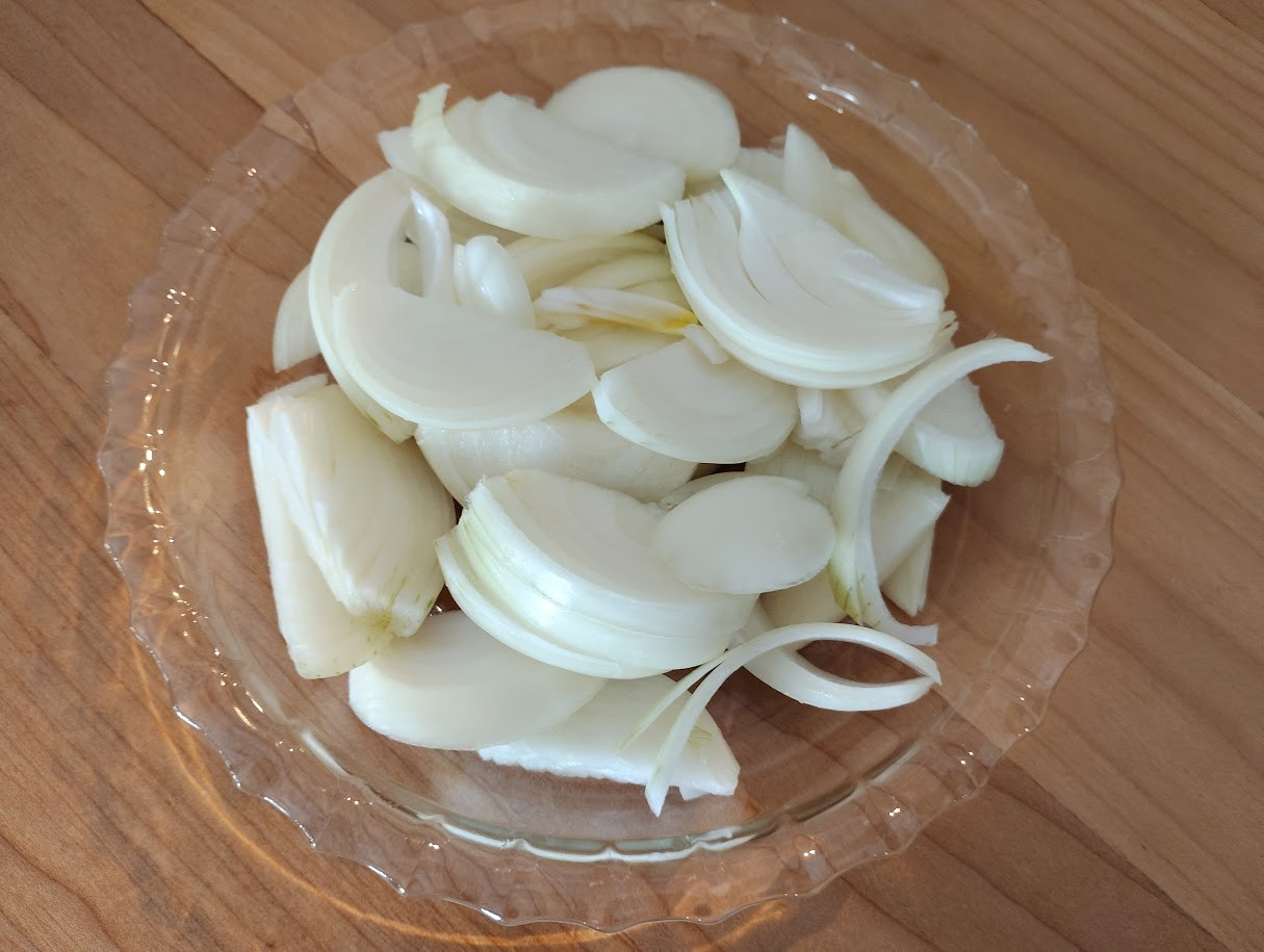 玉ねぎは1.5cm幅のくし切り、豚バラ肉は3cm幅に切ります。豚バラ肉には塩2つまみで下味をつけておきます。