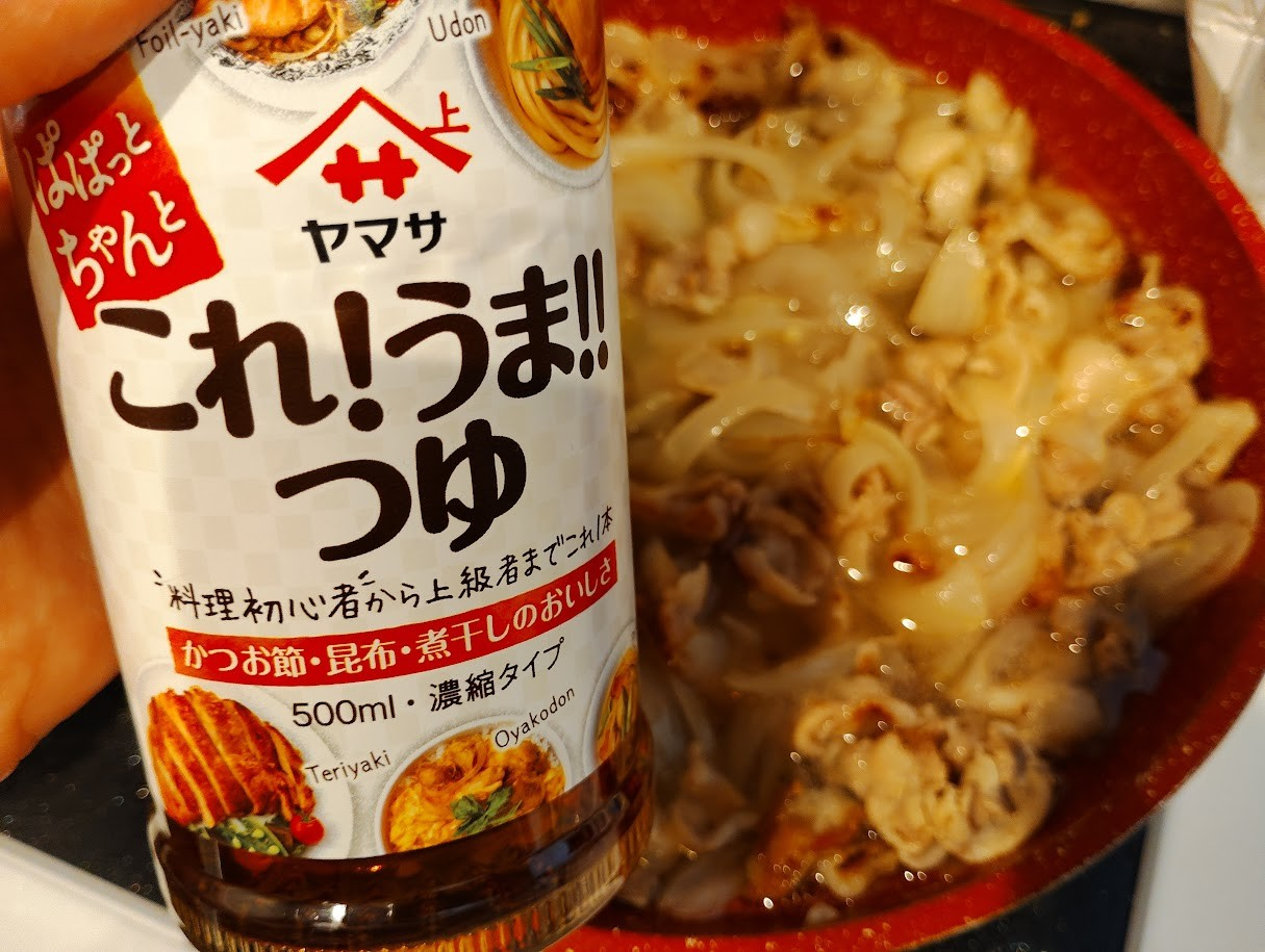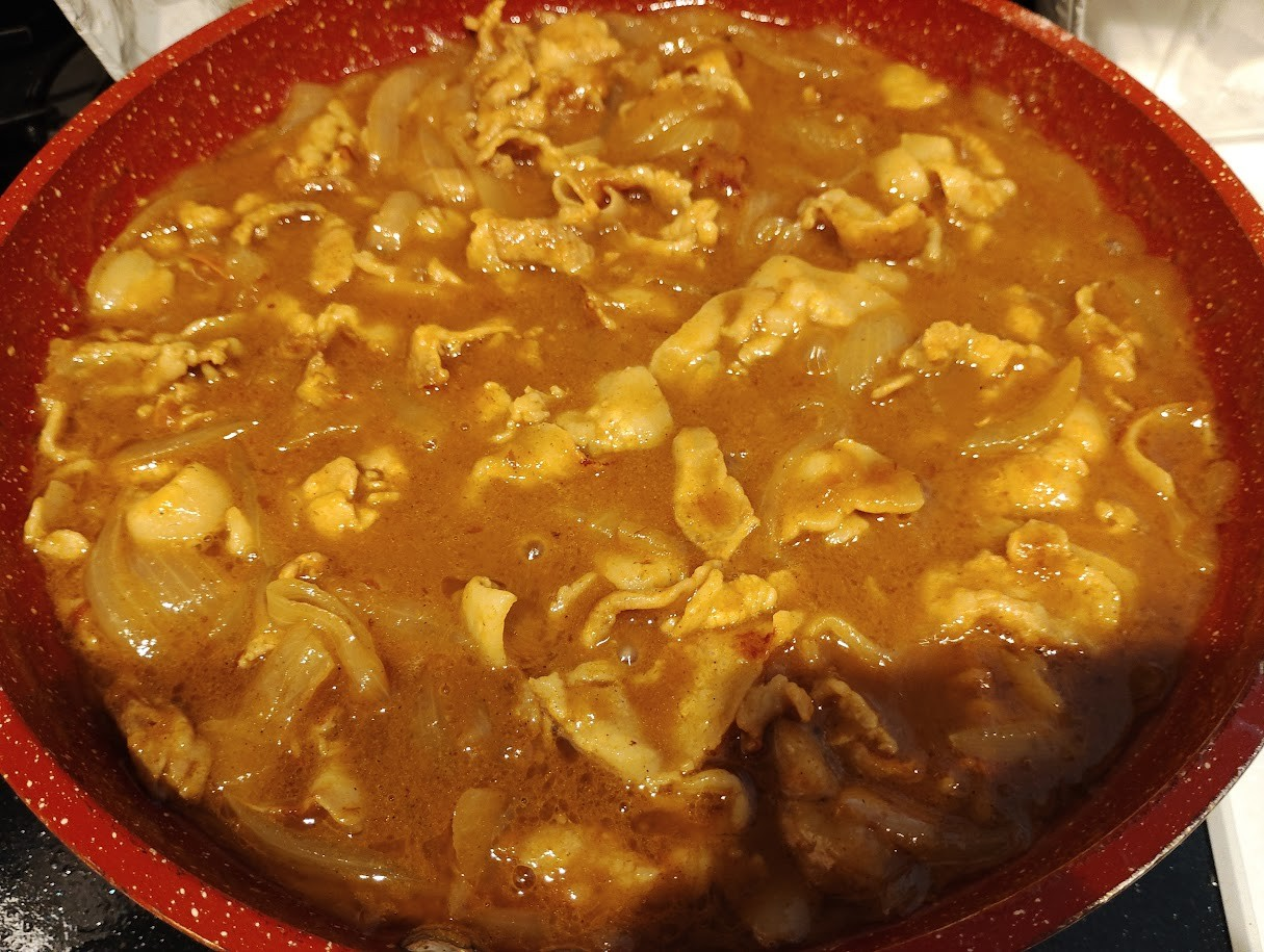 豚バラ肉が炒まり、玉ねぎがしんなりしたら水300cc、これ!うま !!つゆくを大さじ4、醤油小さじ2、砂糖小さじ1と1/3、酒大さじ2、みりん小さじ2、鰹粉(鰹節を細かくしたものでも可)4つまみ、S&B赤缶カレー粉大さじ2を入れよく混ぜます。