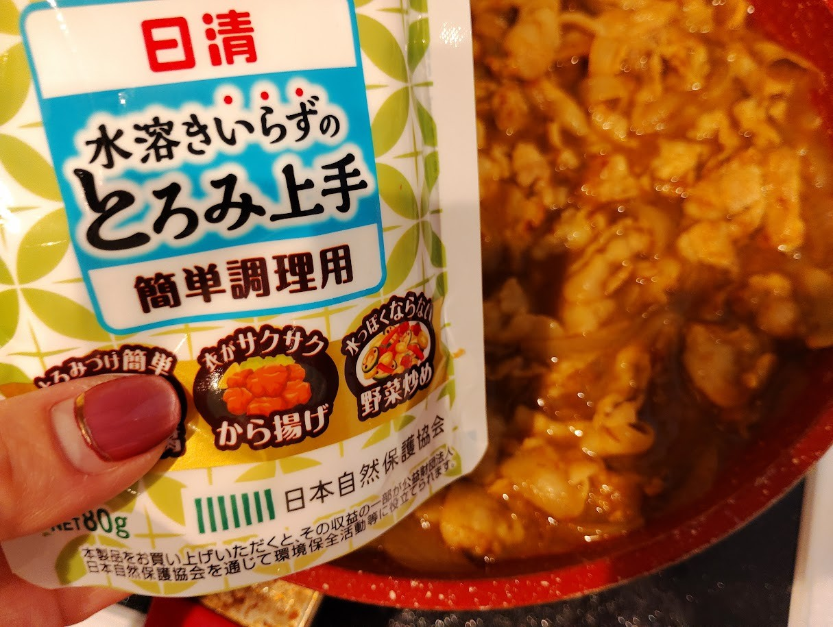 グツグツと煮立ってきたら、水溶き片栗粉(片栗粉大さじ1と小さじ2、水50ccを混ぜたもの)を加え、とろみがついたら出来上がりです。