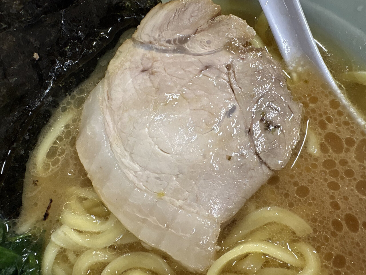 家系ラーメンの定番トッピングであるほうれん草。しっかりと茹でられていて、ふんわりとした食感です。濃厚なスープの中で、口当たりを少しやわらげてくれます。