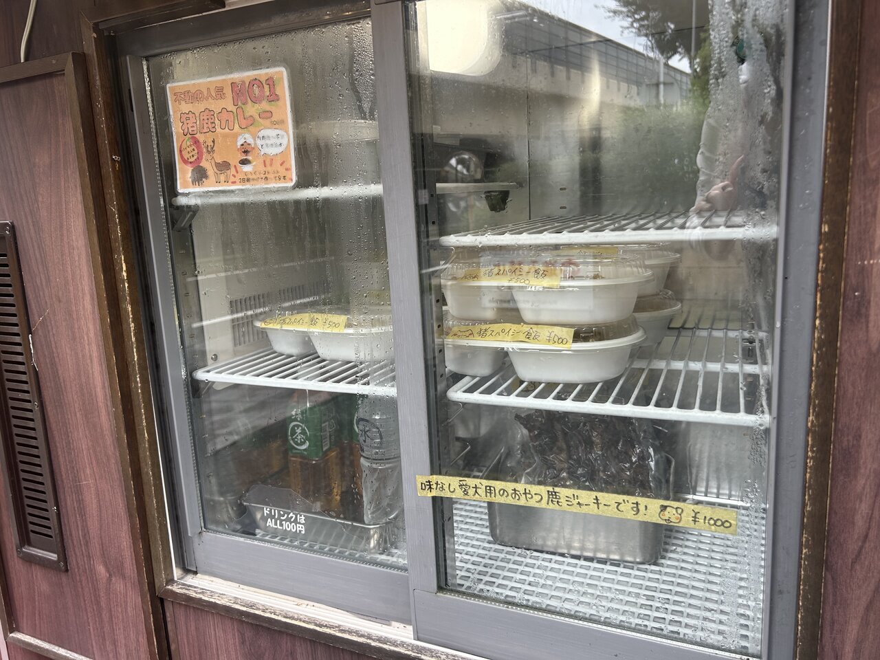 Let's check the refrigerator inside the unmanned vending machine. On the top shelf was the seemingly unshakable popular No. 1, "Wild Boar and Deer Curry" (500 yen). It's said to be simmered for two days, which sounds very appealing, but it doesn't come with rice... On the lower shelf, the "Wild Boar Spicy Rice" (500 yen) does come with rice, making it seem just right for lunch!