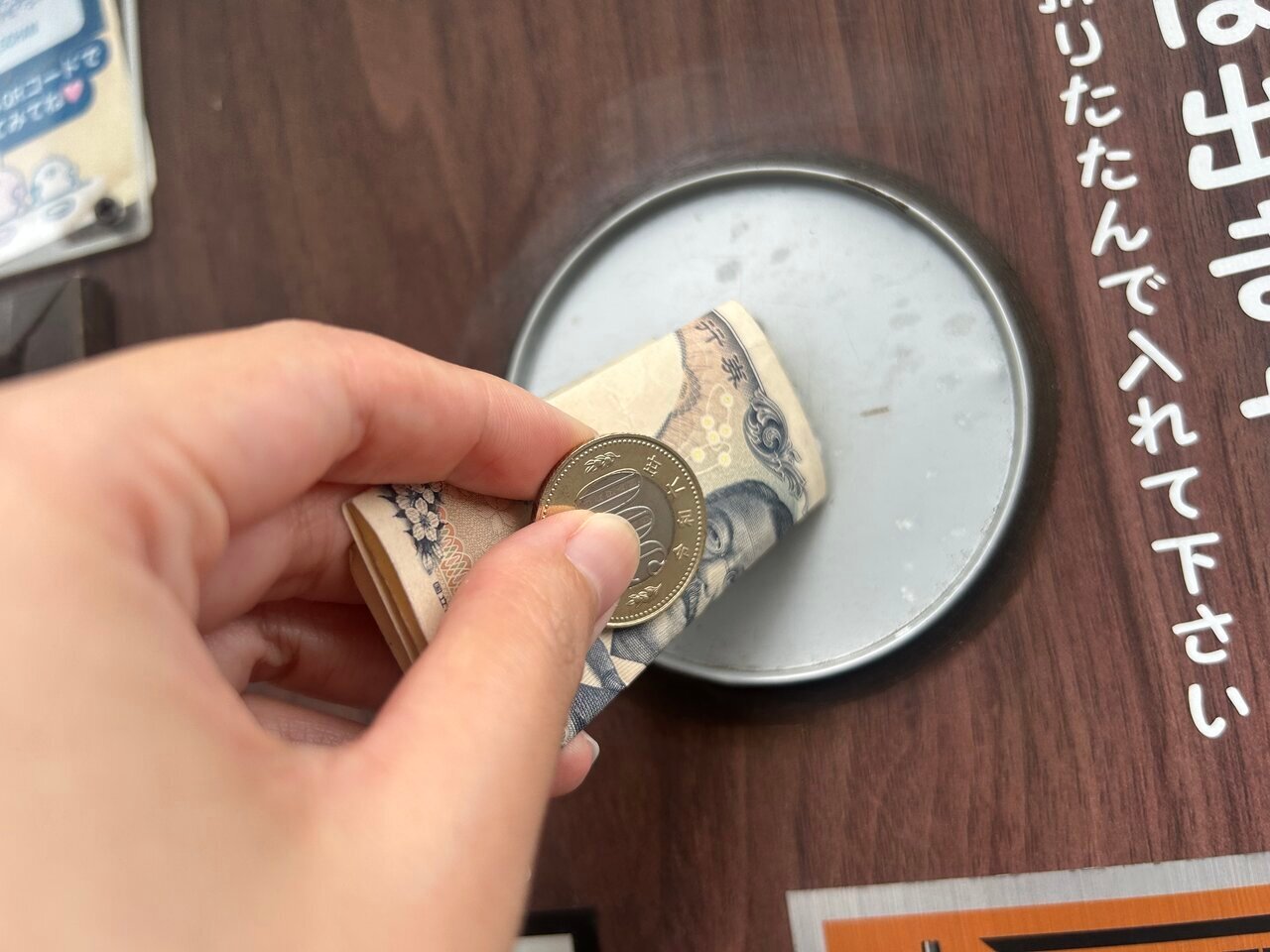 It's not a vending machine, but an unmanned sales machine. It seems you put the money into a slot. It was particularly difficult to get bills in, but I folded them small and managed to put them in.